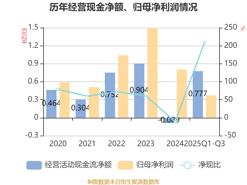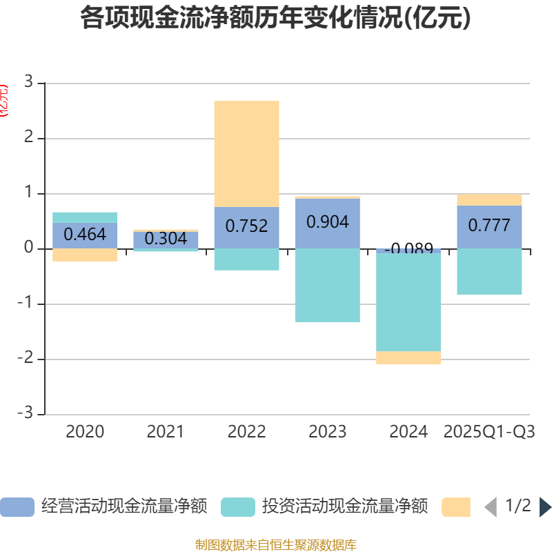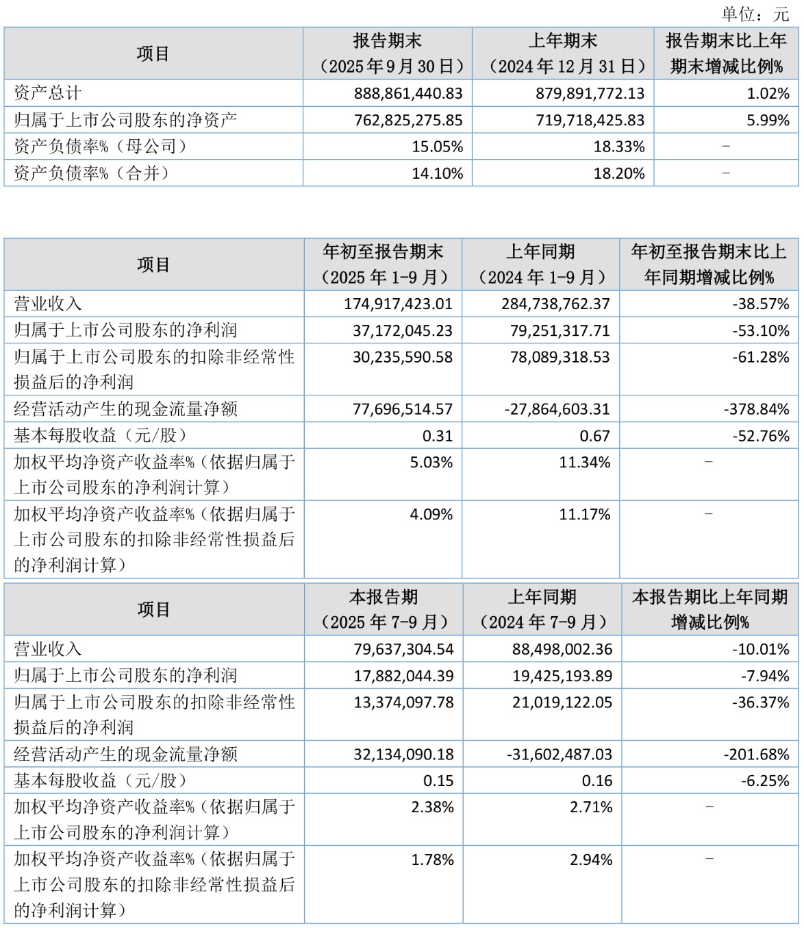2025年前三季度,公司经营活动现金流净额为7769.65万元,同比增加1.06亿元;筹资活动现金流净额2042.47万元,同比增加6323.33万元;投资活动现金流净额-8378.51万元,上年同期为-1.76亿元。