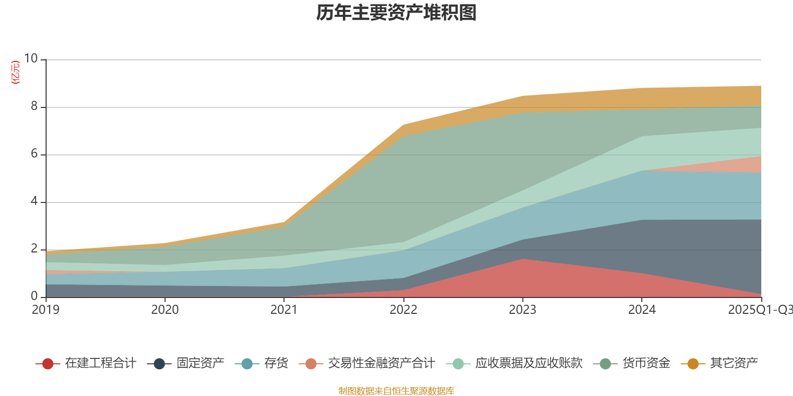 资产重大变化方面,截至2025年三季度末,公司在建工程合计较上年末减少88.14%,占公司总资产比重下降10.03个百分点;固定资产较上年末增加39.98%,占公司总资产比重上升9.84个百分点;交易性金融资产合计占公司总资产的7.8%,上年末为0;应收票据及应收账款较上年末减少17.77%,占公司总资产比重下降3.06个百分点。