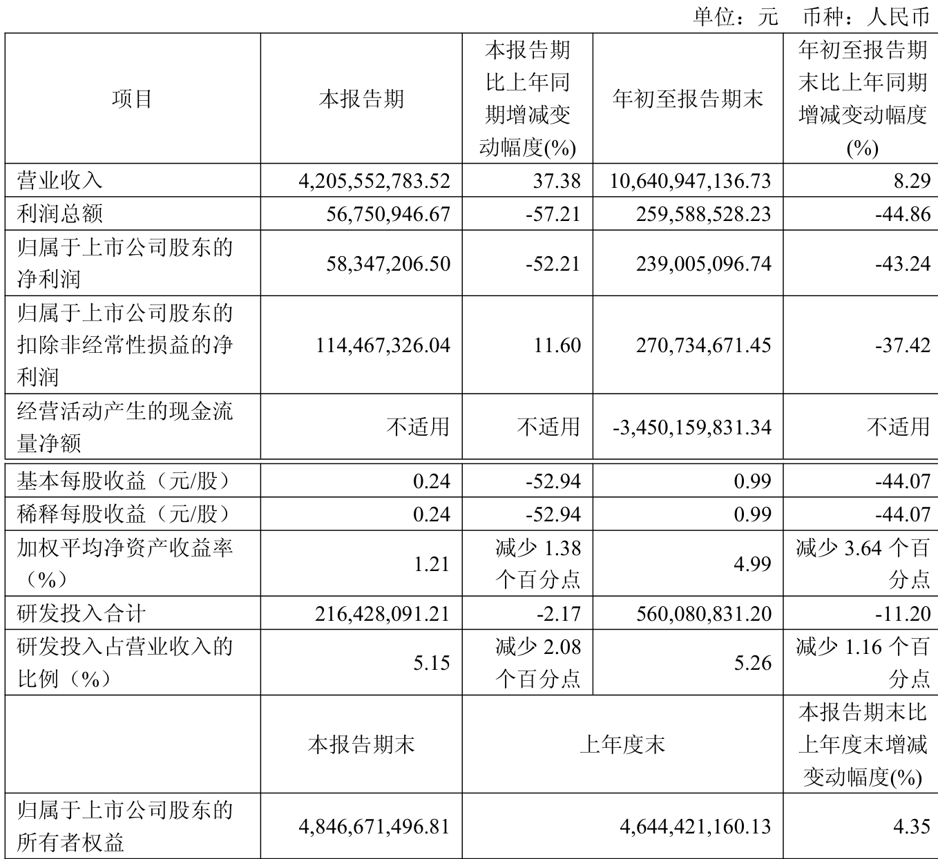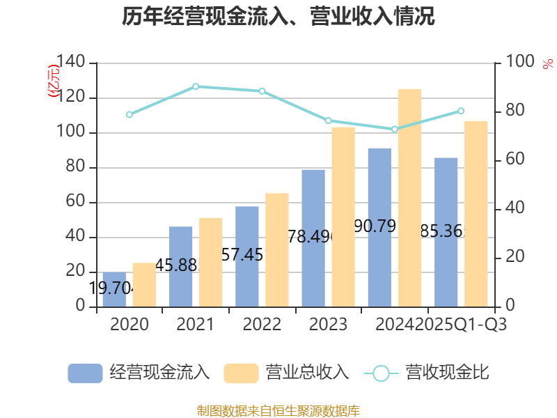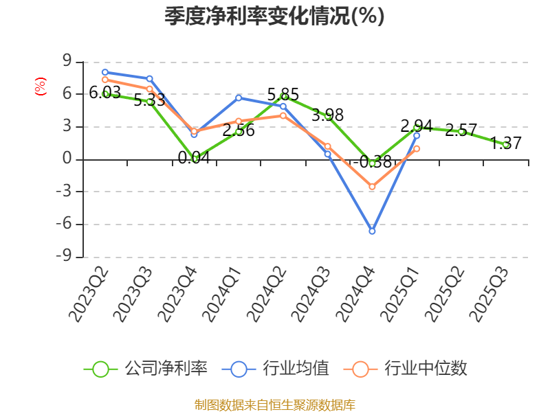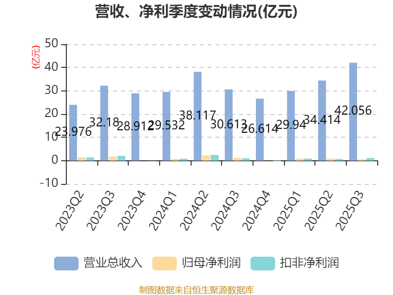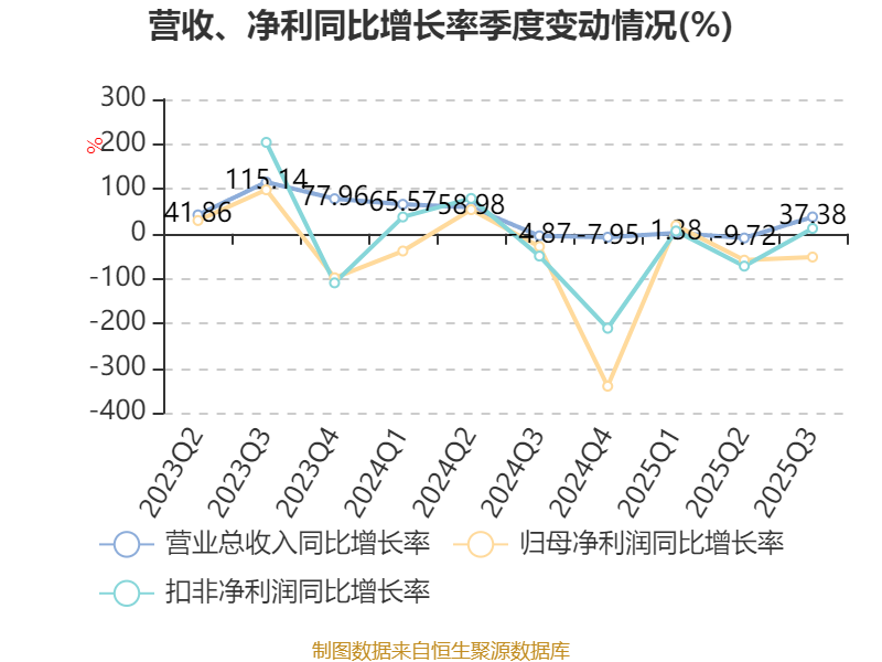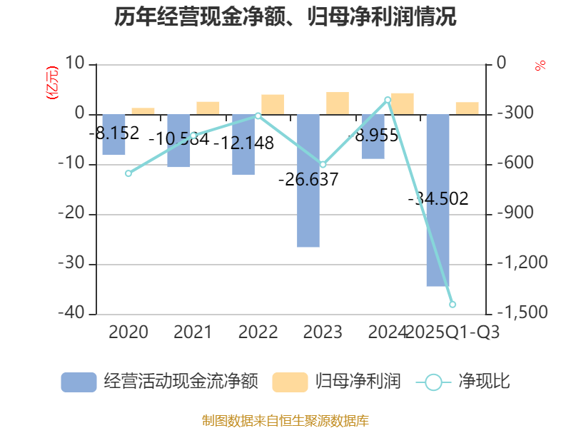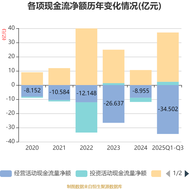 2025年前三季度,公司经营活动现金流净额为-34.5亿元,同比减少26.52亿元;筹资活动现金流净额34.77亿元,同比增加25.83亿元;投资活动现金流净额2.3亿元,上年同期为-3.81亿元。