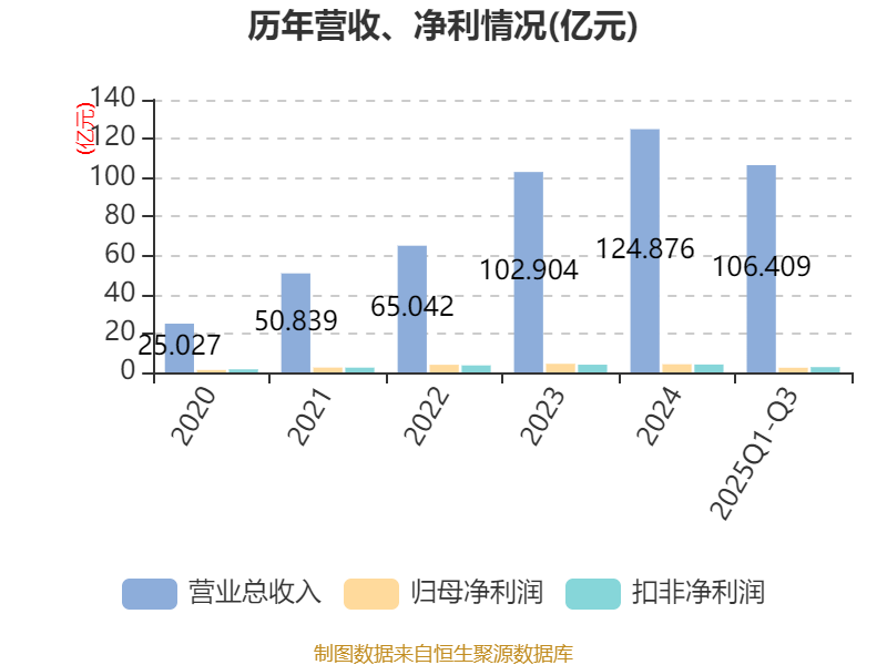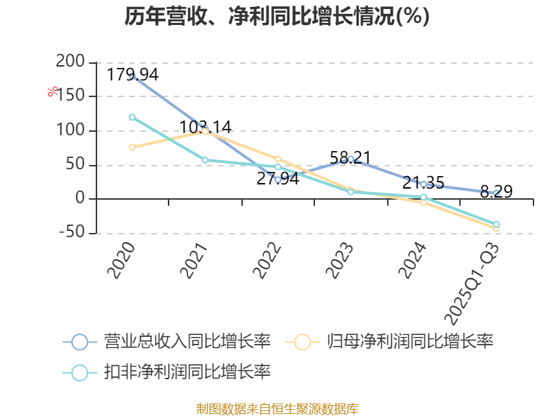 中证智能财讯聚和材料(688503)10月28日披露2025年第三季度报告。前三季度公司实现营业总收入106.41亿元,同比增长8.29%;归母净利润2.39亿元,同比下降43.24%;扣非净利润2.71亿元,同比下降37.42%;经营活动产生的现金流量净额为-34.5亿元,上年同期为-7.98亿元;报告期内,聚和材料基本每股收益为0.99元,加权平均净资产收益率为4.99%。
