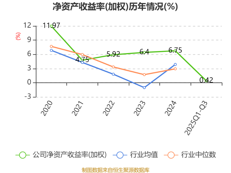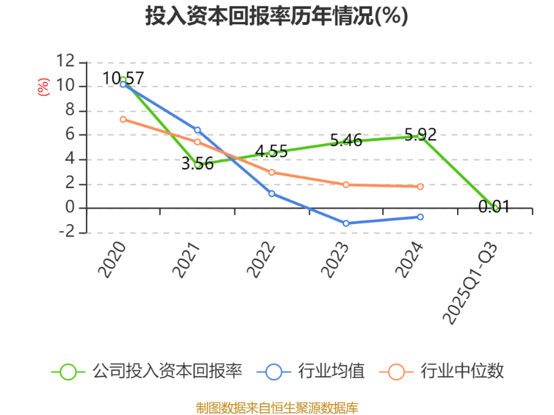 盈利能力方面, 2025年前三季度公司加权平均净资产收益率为0.42%,同比下降0.7个百分点。公司2025年前三季度投入资本回报率为0.01%,较上年同期下降0.56个百分点。