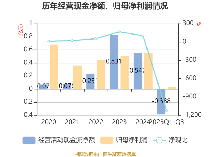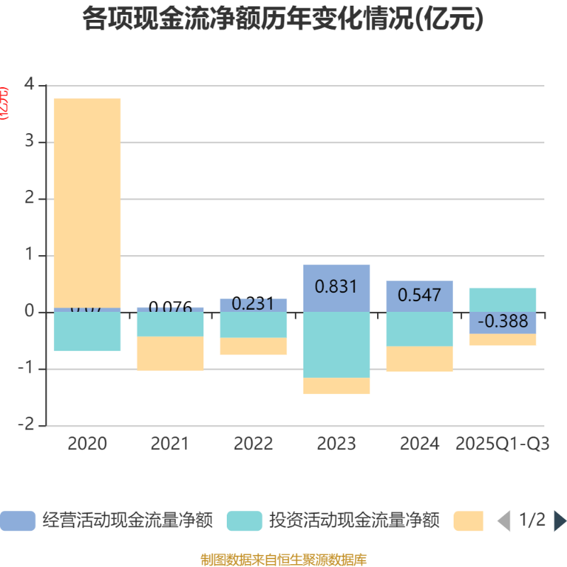 2025年前三季度,公司经营活动现金流净额为-3884.93万元,同比减少1369.44万元;筹资活动现金流净额-2054.11万元,同比增加2487.37万元;投资活动现金流净额4179.66万元,上年同期为-5788.05万元。