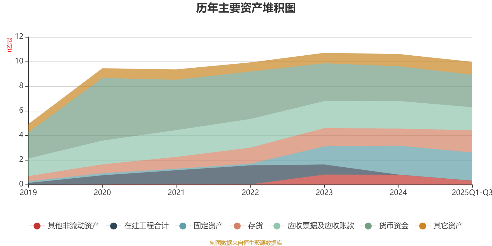 资产重大变化方面,截至2025年三季度末,公司存货较上年末增加30.06%,占公司总资产比重上升5.02个百分点;其他非流动资产较上年末减少62.12%,占公司总资产比重下降4.51个百分点;应收票据及应收账款较上年末减少16.3%,占公司总资产比重下降2.32个百分点;固定资产较上年末减少2.59%,占公司总资产比重上升0.81个百分点。