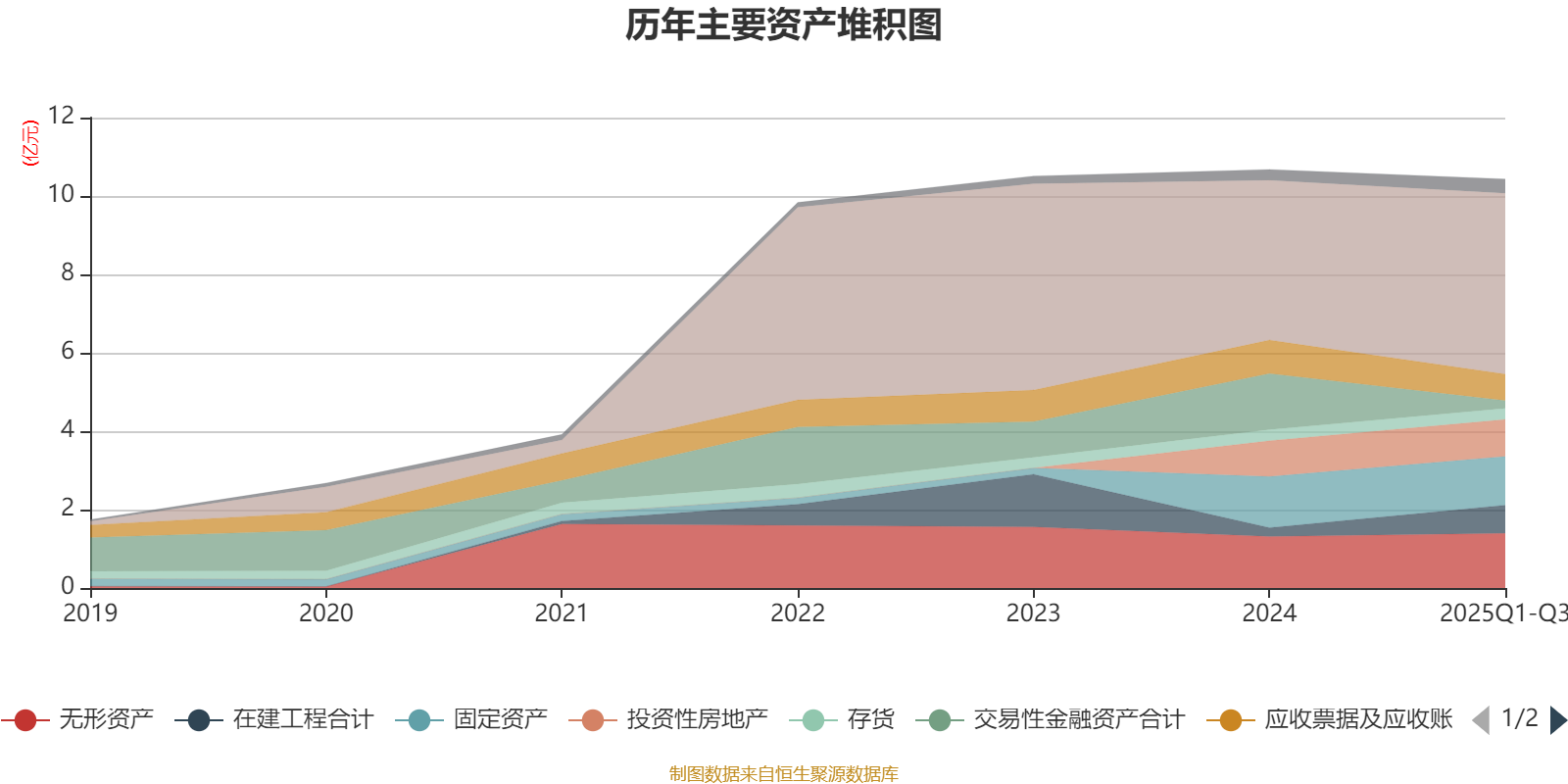 资产重大变化方面,截至2025年三季度末,公司交易性金融资产合计较上年末减少86.04%,占公司总资产比重下降11.51个百分点;货币资金较上年末增加13.06%,占公司总资产比重上升6个百分点;在建工程合计较上年末增加220.9%,占公司总资产比重上升4.81个百分点;应收票据及应收账款较上年末减少20.85%,占公司总资产比重下降1.52个百分点。