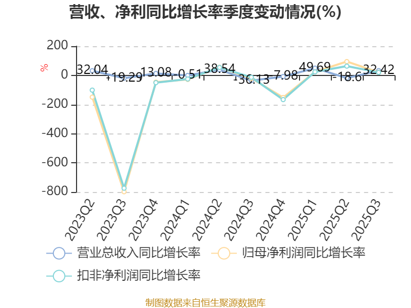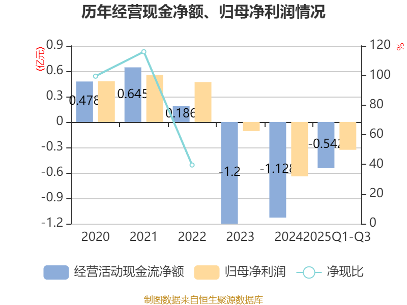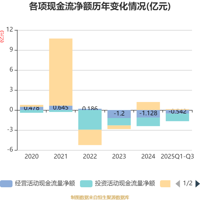 2025年前三季度,公司经营活动现金流净额为-5423.99万元,同比增加1.03亿元;筹资活动现金流净额1333.59万元,同比减少8919.25万元;投资活动现金流净额-1.14亿元,上年同期为-1.65亿元。