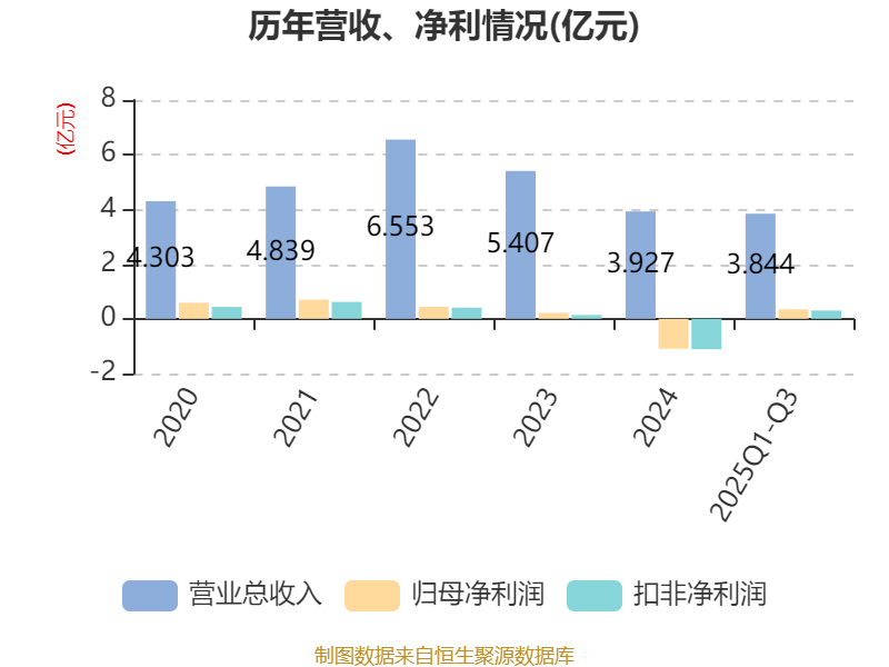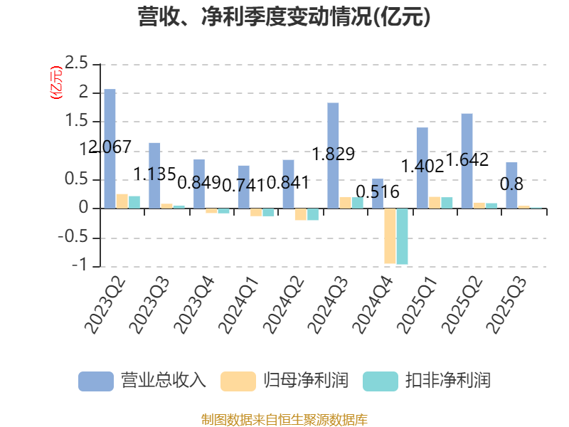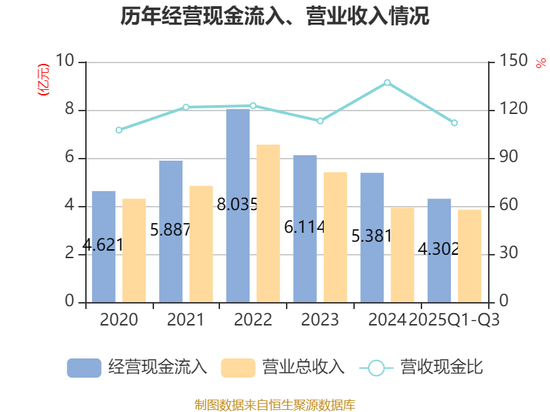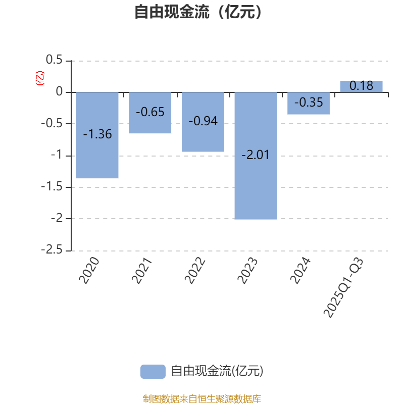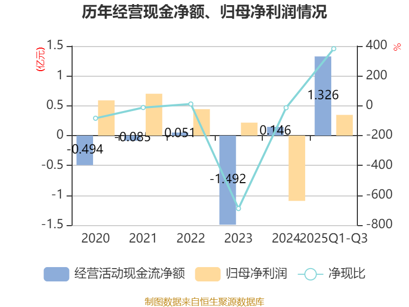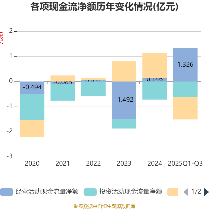 2025年前三季度,公司经营活动现金流净额为1.33亿元,同比增加1.86亿元;筹资活动现金流净额-8998.47万元,同比减少1.5亿元;投资活动现金流净额-6130.3万元,上年同期为-4849.72万元。