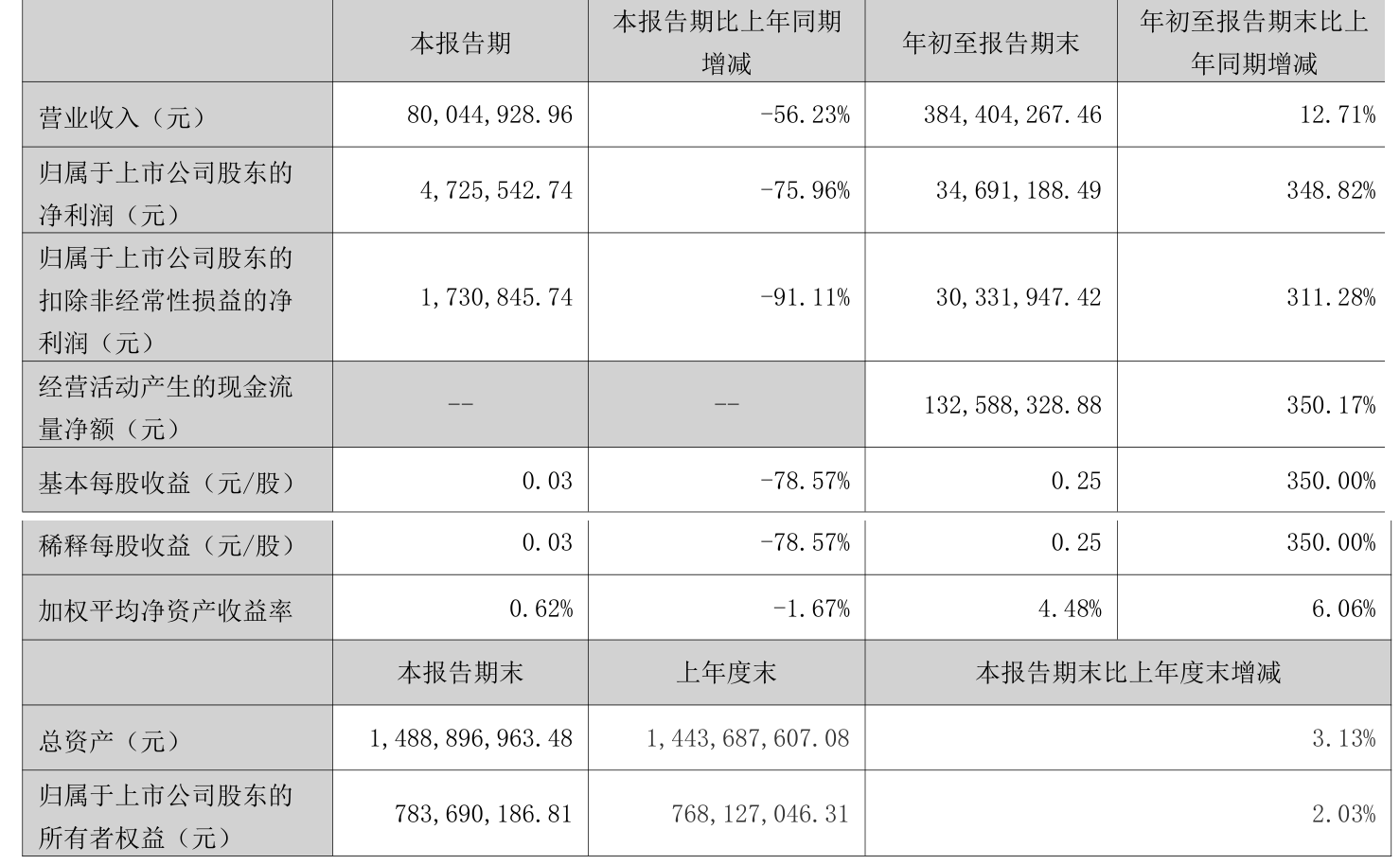 中证智能财讯易天股份(300812)10月28日披露2025年第三季度报告。前三季度公司实现营业总收入3.84亿元,同比增长12.71%;归母净利润3469.12万元,同比扭亏;扣非净利润3033.19万元,同比扭亏;经营活动产生的现金流量净额为1.33亿元,上年同期为-5299.89万元;报告期内,易天股份基本每股收益为0.25元,加权平均净资产收益率为4.48%。