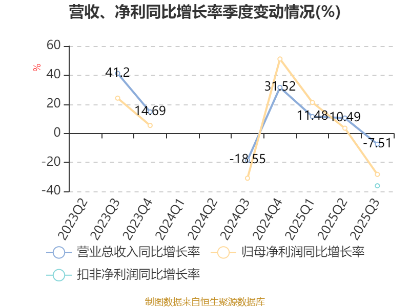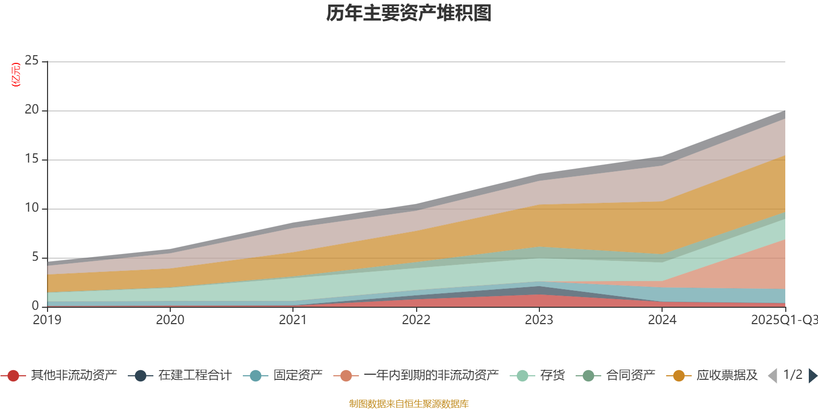 资产重大变化方面,截至2025年三季度末,公司一年内到期的非流动资产较上年末增加669.04%,占公司总资产比重上升21个百分点;应收票据及应收账款较上年末增加7.74%,占公司总资产比重下降6.11个百分点;货币资金较上年末增加2.44%,占公司总资产比重下降5.11个百分点;固定资产较上年末减少1.37%,占公司总资产比重下降2.32个百分点。