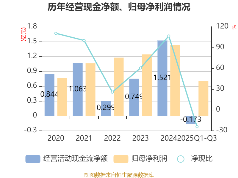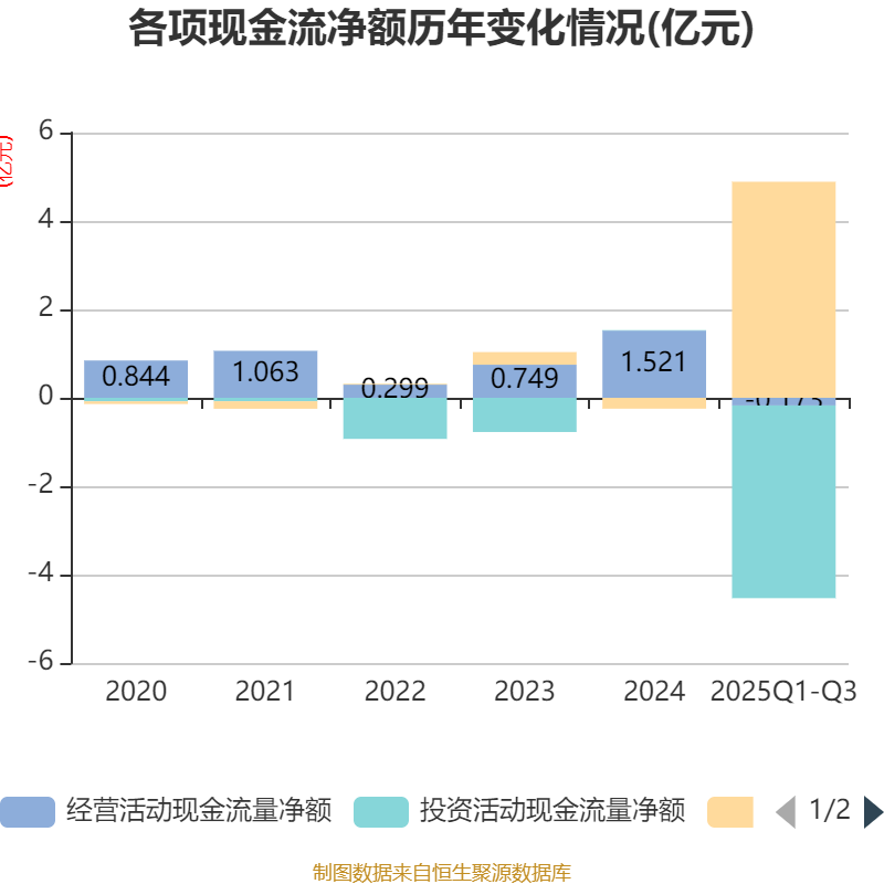 2025年前三季度,公司经营活动现金流净额为-1728.29万元,同比减少2129.45万元;筹资活动现金流净额4.89亿元,同比增加5.13亿元;投资活动现金流净额-4.36亿元,上年同期为266.46万元。