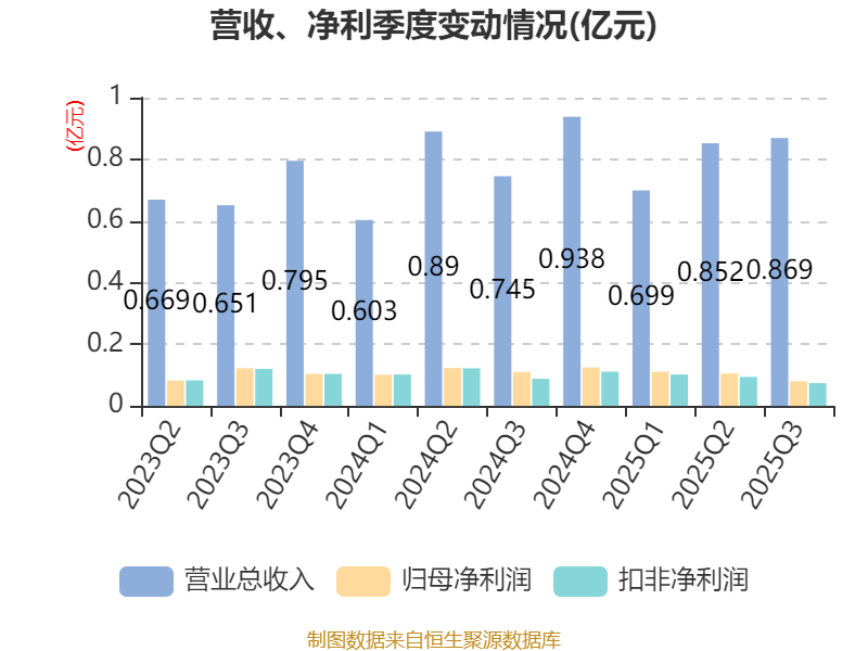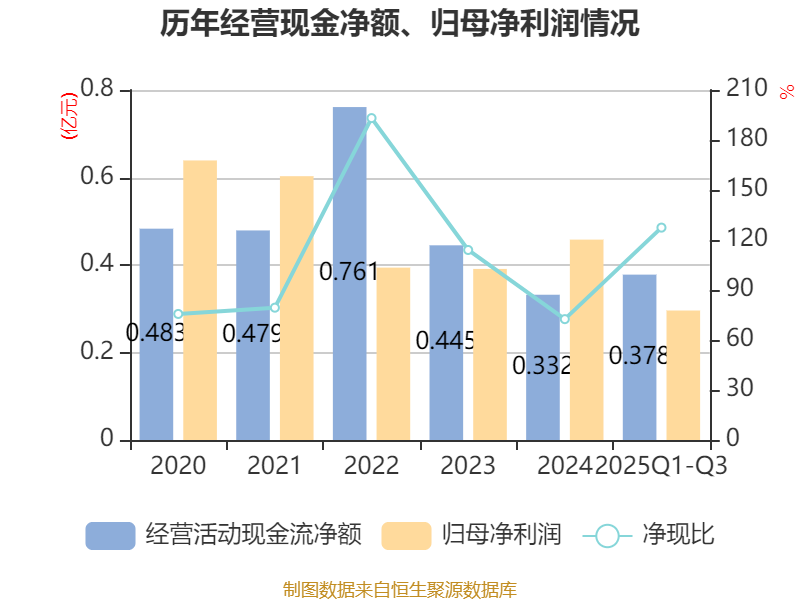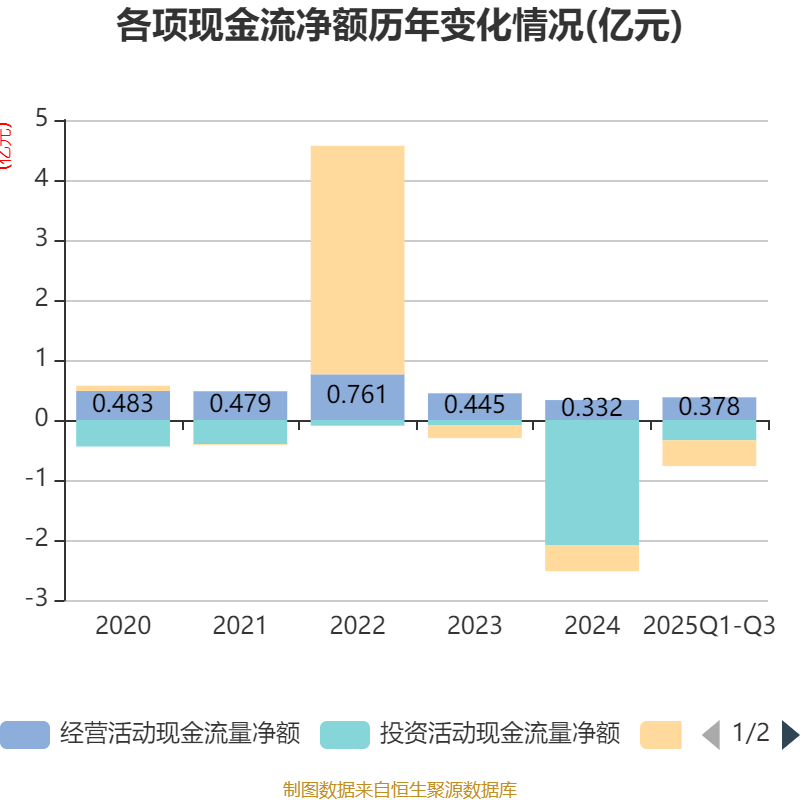 2025年前三季度,公司经营活动现金流净额为3775.22万元,同比增长148.55%;筹资活动现金流净额-4301.9万元,与同期相比基本不变;投资活动现金流净额-3379.13万元,上年同期为-2.09亿元。