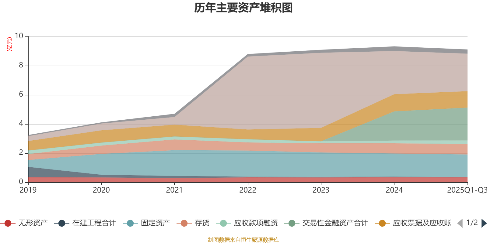 资产重大变化方面,截至2025年三季度末,公司货币资金较上年末减少13.25%,占公司总资产比重下降3.58个百分点;交易性金融资产合计较上年末增加12.85%,占公司总资产比重上升3.32个百分点;其他应收款(含利息和股利)较上年末减少94.45%,占公司总资产比重下降0.81个百分点;应收款项融资较上年末增加25.54%,占公司总资产比重上升0.58个百分点。