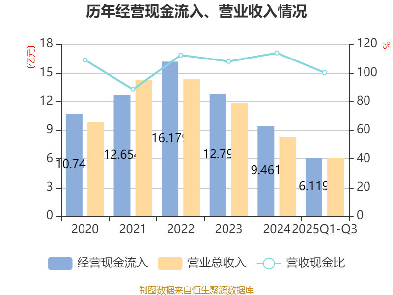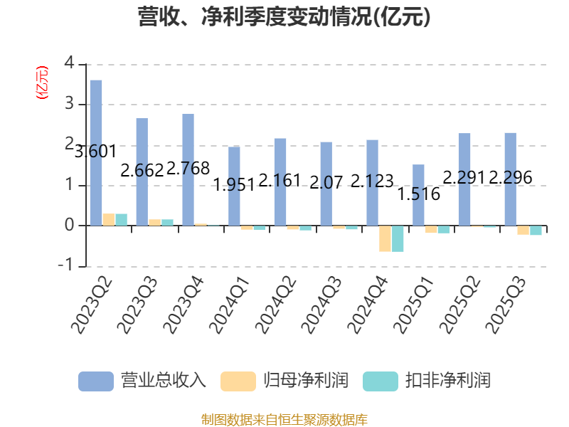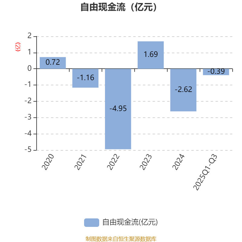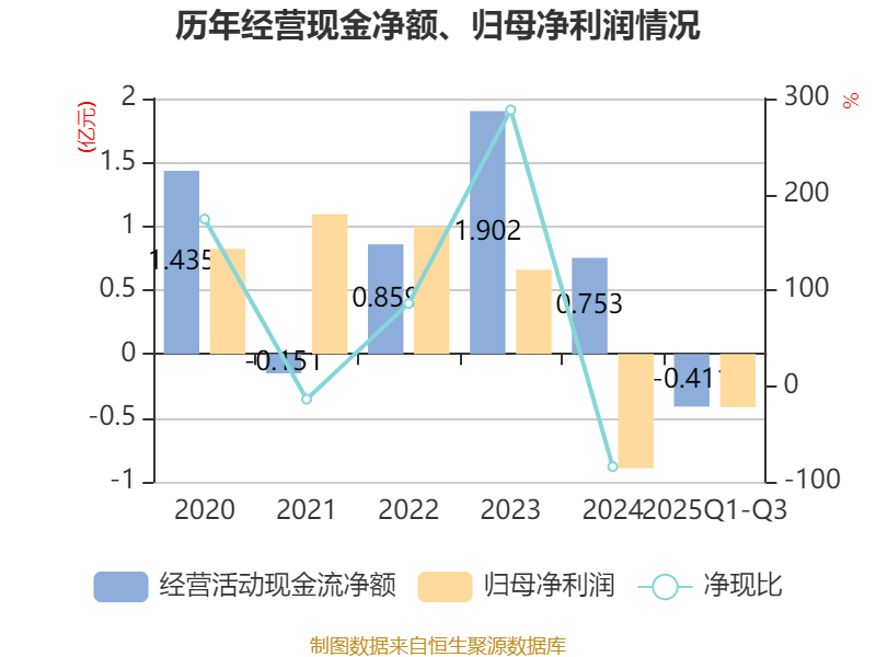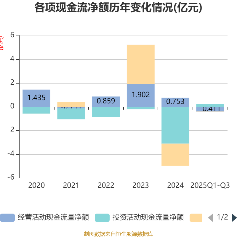 2025年前三季度,公司经营活动现金流净额为-4107.14万元,同比减少1.01亿元;筹资活动现金流净额-116.31万元,同比增加1.85亿元;投资活动现金流净额2130.02万元,上年同期为-3.57亿元。