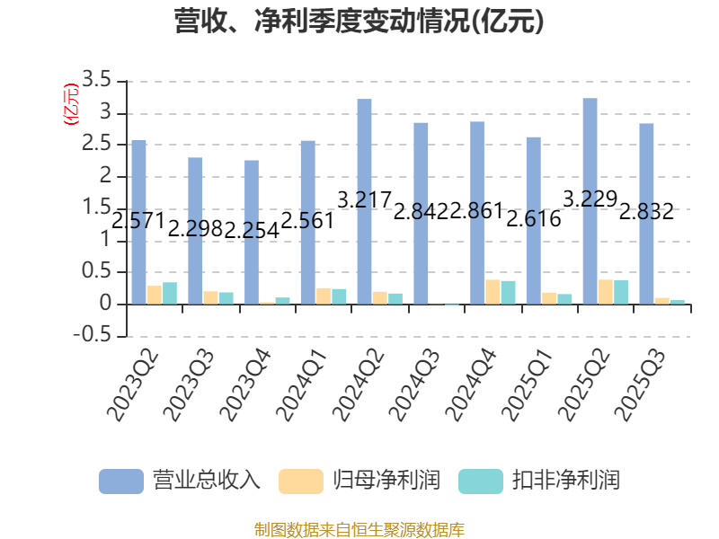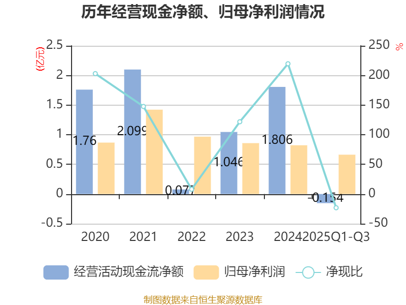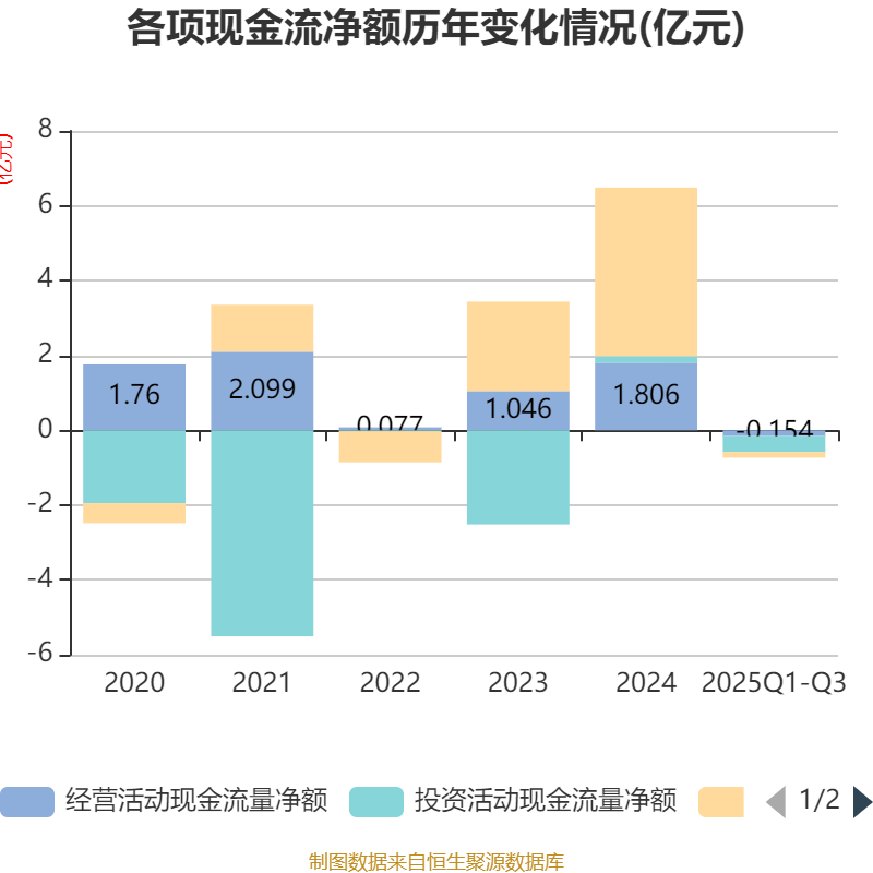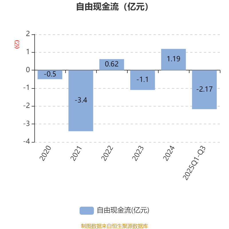 2025年前三季度,公司经营活动现金流净额为-1535.89万元,同比减少9541.03万元;筹资活动现金流净额-1488.9万元,同比减少6.1亿元;投资活动现金流净额-4293.01万元,上年同期为1266.85万元。