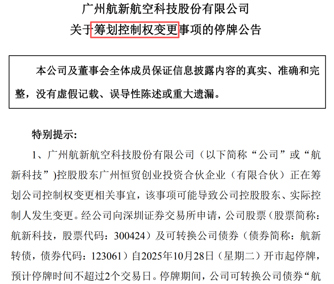 10月27日晚,航新科技公告,公司于2025年10月27日收到控股股东广州恒贸创业投资合伙企业(有限合伙)(以下简称广州恒贸)出具的《关于拟转让航新科技股份控制权的告知函》,获悉广州恒贸正在筹划公司控制权变更事项,该事项可能导致公司控股股东、实际控制人发生变更。