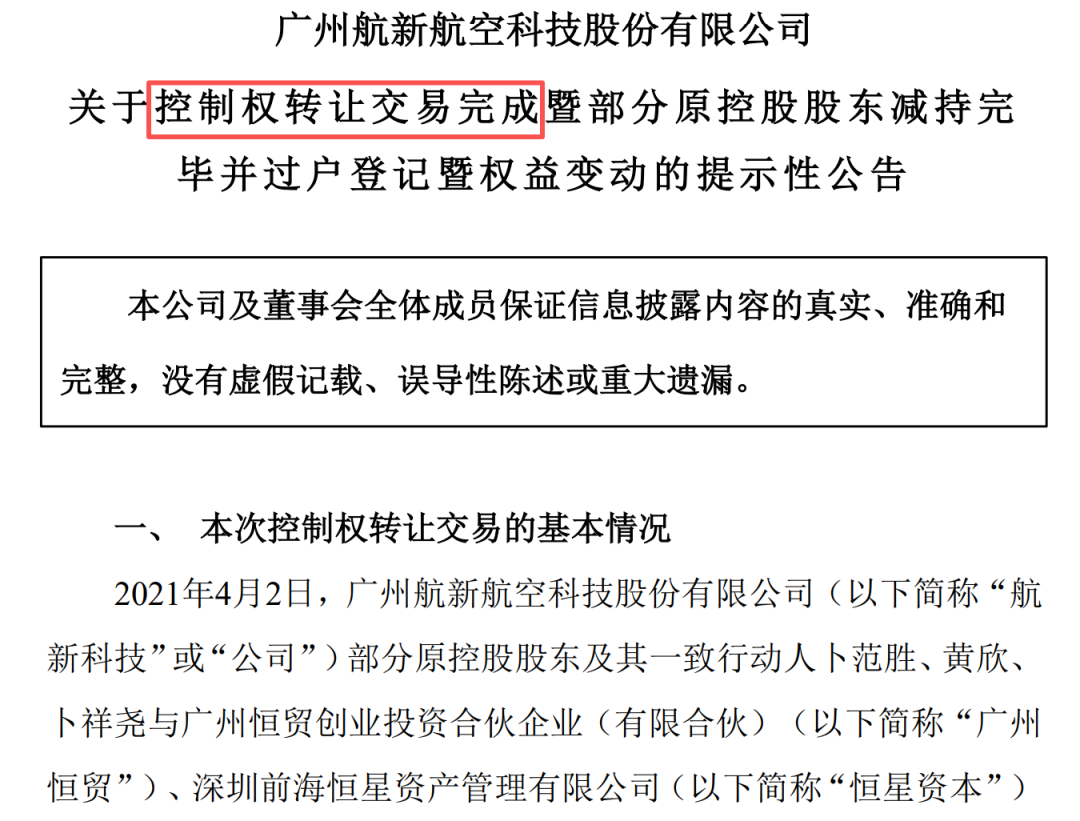 2022年9月9日,航新科技公告,卜范胜、黄欣转让给深圳前海恒星-广州恒贸的无限售流通股合计1757.51万股已完成过户登记手续,卜范胜、黄欣与广州恒贸约定的标的股份已全部转让完毕。至此,恒星资本通过广州恒贸正式入主航新科技,背后的实控人则是余厚蜀。