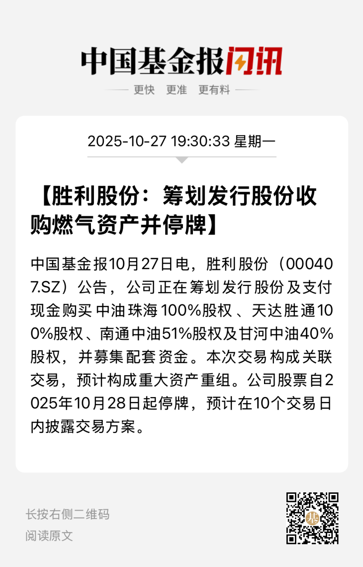 10月27日,胜利股份公告称,公司正在筹划发行股份及支付现金购买由控股股东及其关联方控制的燃气类相关资产并募集配套资金。