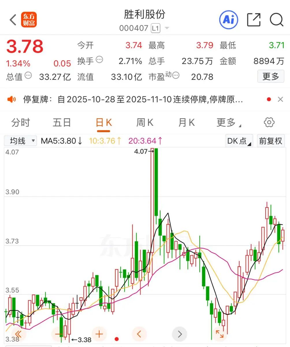 截至10月27日收盘,胜利股份报收于3.78元/股,最新市值为33.27亿元。