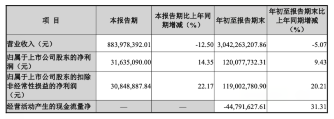 同日,胜利股份公布了三季报,公司前三季度实现营收30.42亿元,同比下降5.07%;净利润为1.2亿元,同比增长9.43%。