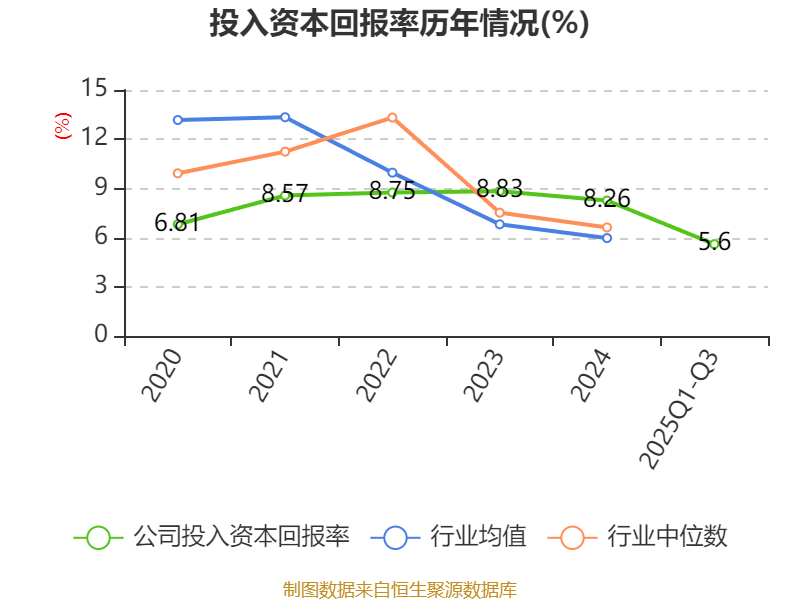 盈利能力方面, 2025年前三季度公司加权平均净资产收益率为6.56%,同比下降0.72个百分点。公司2025年前三季度投入资本回报率为5.6%,较上年同期下降0.47个百分点。