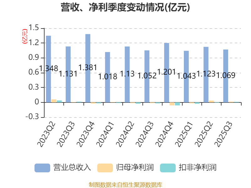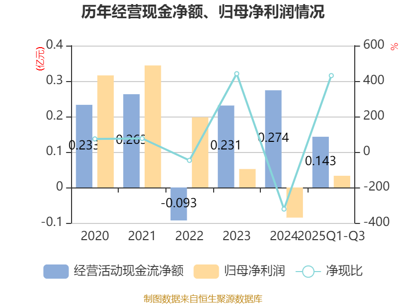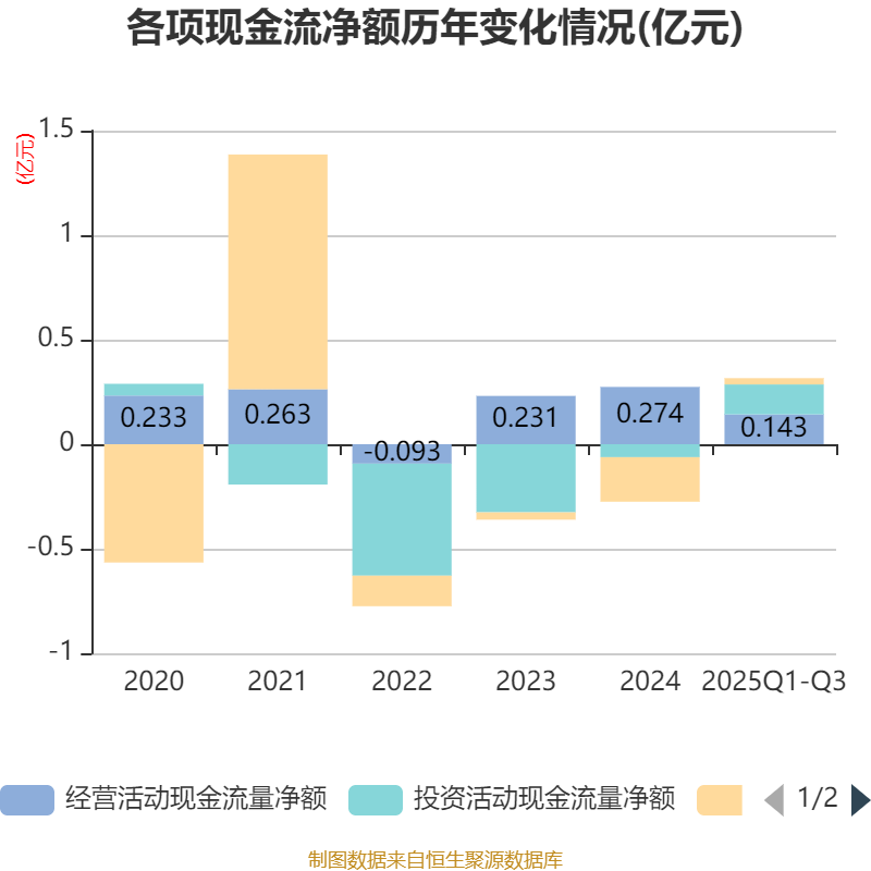 2025年前三季度,公司经营活动现金流净额为1434.31万元,同比增加3068.74万元;筹资活动现金流净额299.82万元,同比增加1306.33万元;投资活动现金流净额1430.43万元,上年同期为291.31万元。