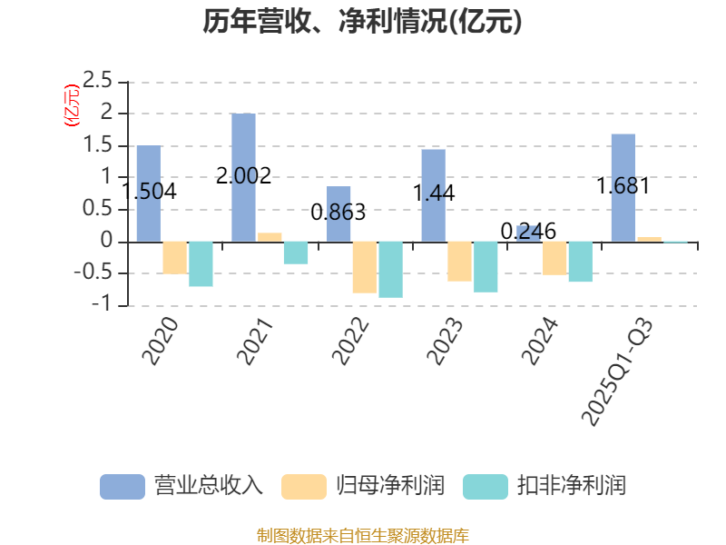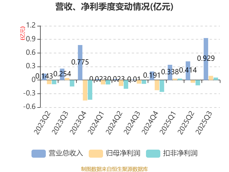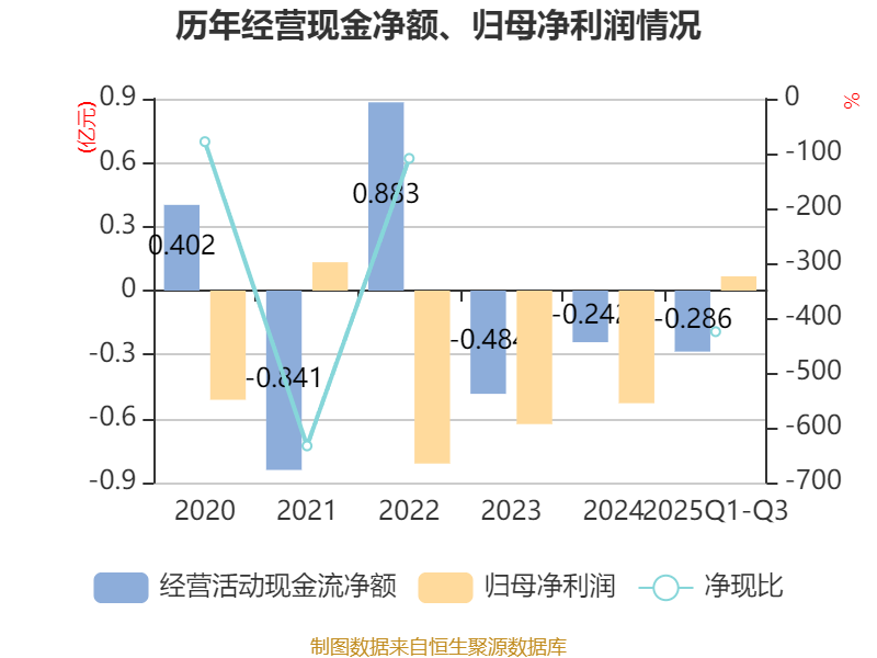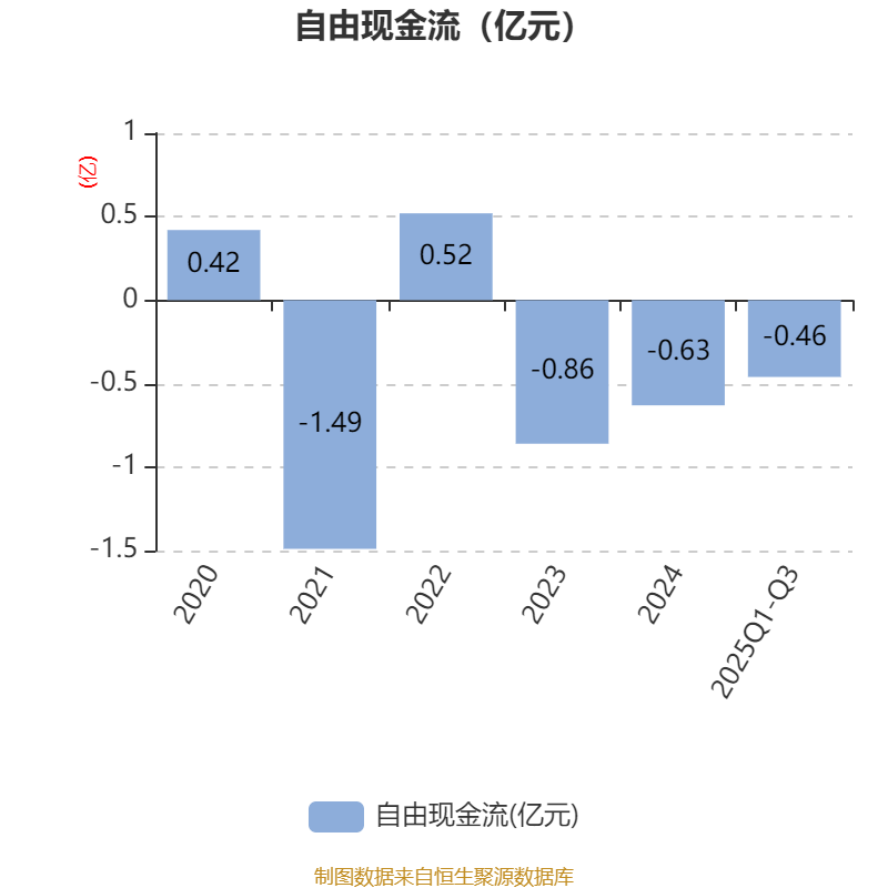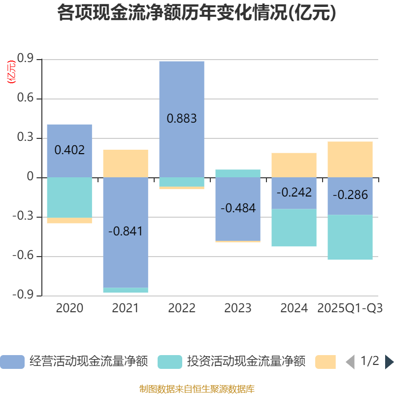 2025年前三季度,公司经营活动现金流净额为-2861万元,同比增加1723.7万元;筹资活动现金流净额2717.83万元,同比增加2869.8万元;投资活动现金流净额-3409.33万元,上年同期为-2793.19万元。