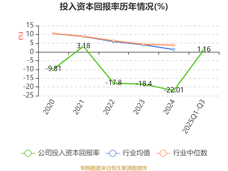 盈利能力方面, 2025年前三季度公司加权平均净资产收益率为2.96%,同比上升14.66个百分点。公司2025年前三季度投入资本回报率为1.16%,较上年同期上升14.2个百分点。