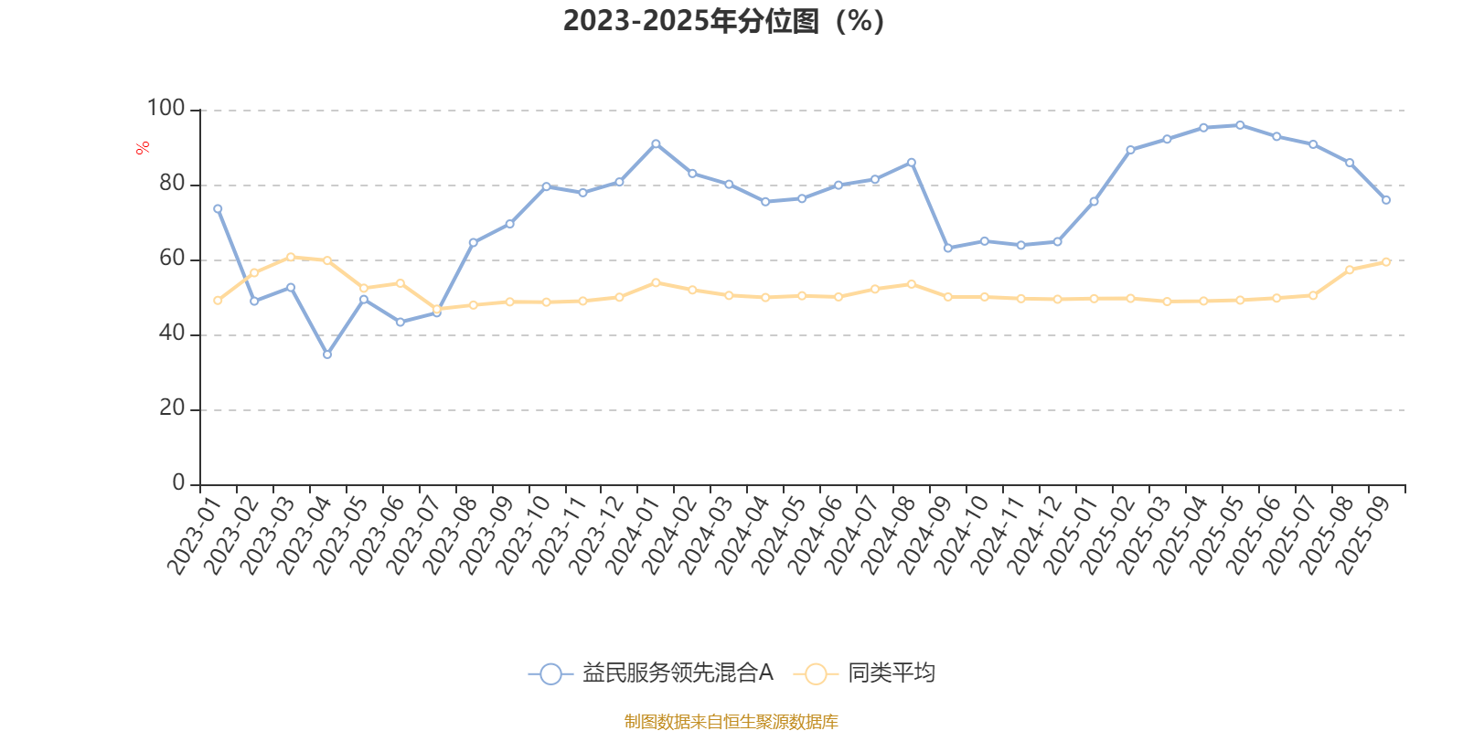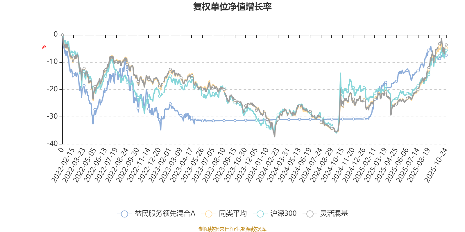 截至10月24日,益民服务领先混合A近三个月复权单位净值增长率为3.50%,位于同类可比基金985/1287;近半年复权单位净值增长率为11.49%,位于同类可比基金971/1287;近一年复权单位净值增长率为33.85%,位于同类可比基金344/1287;近三年复权单位净值增长率为22.93%,位于同类可比基金441/1286。