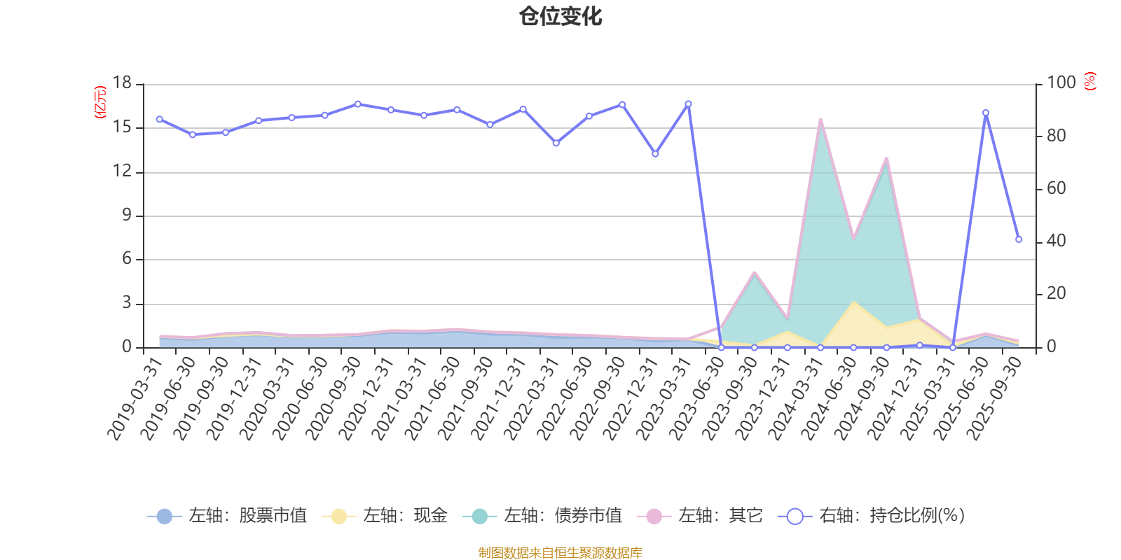 据定期报告数据统计,近三年平均股票仓位为24.75%,同类平均为72.16%。2023年一季度末基金达到92.45%的最高仓位,2024年末最低,为0.89%。