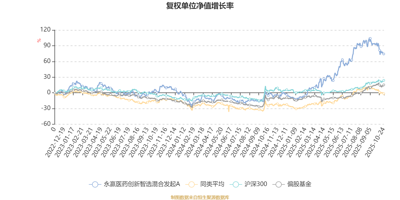 截至10月24日,永赢医药创新智选混合发起A近三个月复权单位净值增长率为-6.84%,位于同类可比基金75/106;近半年复权单位净值增长率为30.40%,位于同类可比基金13/104;近一年复权单位净值增长率为78.75%,位于同类可比基金1/101。
