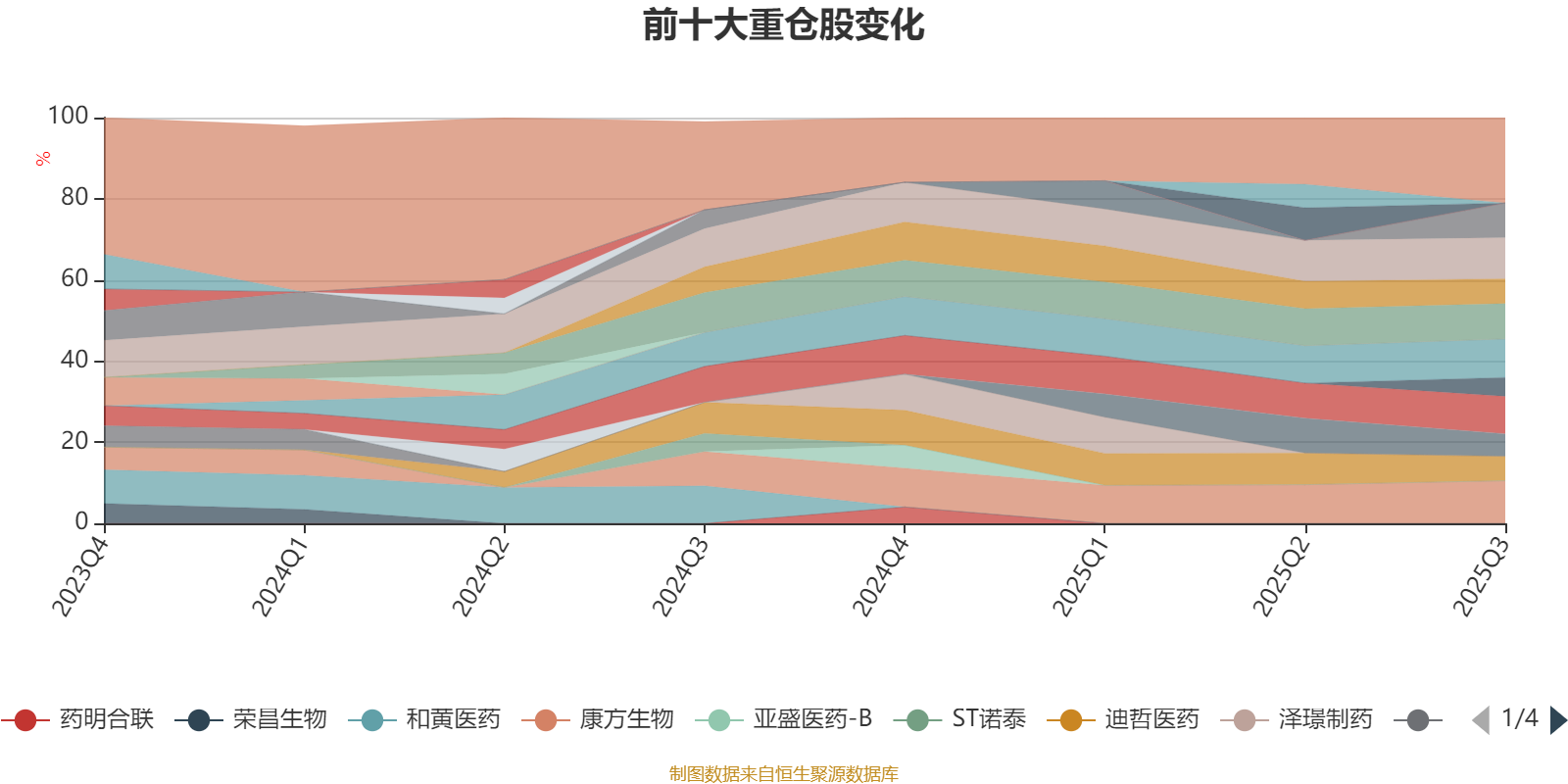 该基金持股集中度较高。截至2025年三季度末,基金十大重仓股分别是康方生物、信达生物、科伦博泰生物-B、百济神州、百利天恒、恒瑞医药、奥赛康、迪哲医药、三生制药、药明康德。