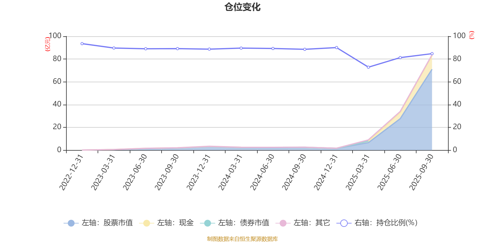 据定期报告数据统计,近三年平均股票仓位为87.23%,同类平均为86.81%。2022年末基金达到93.54%的最高仓位,2025年一季度末最低,为72.89%。