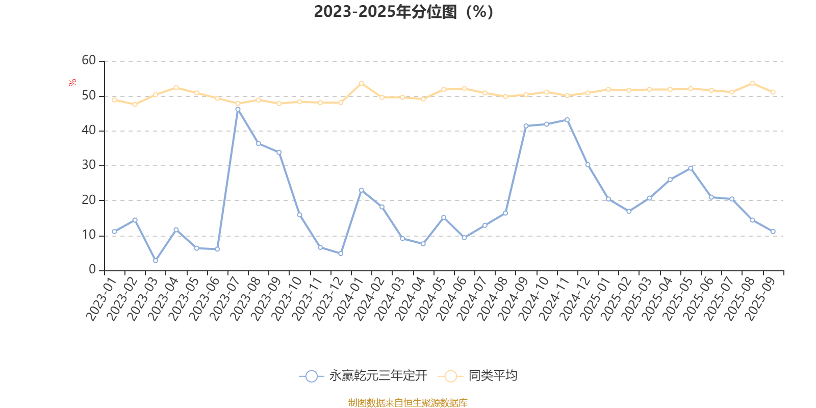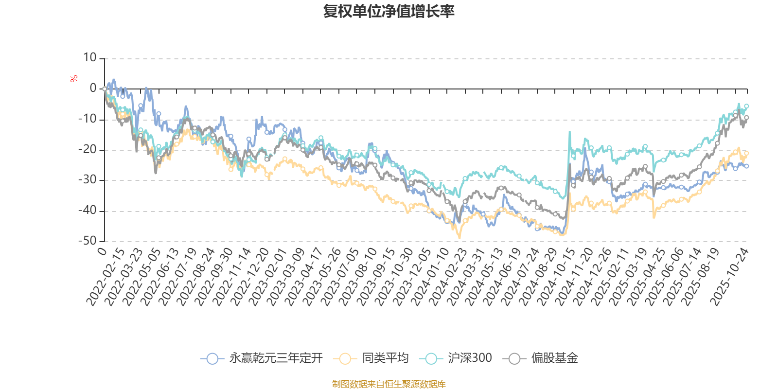 截至10月24日,永赢乾元三年定开近三个月复权单位净值增长率为2.32%,位于同类可比基金611/689;近半年复权单位净值增长率为10.53%,位于同类可比基金624/688;近一年复权单位净值增长率为4.49%,位于同类可比基金618/653;近三年复权单位净值增长率为-2.08%,位于同类可比基金255/363。