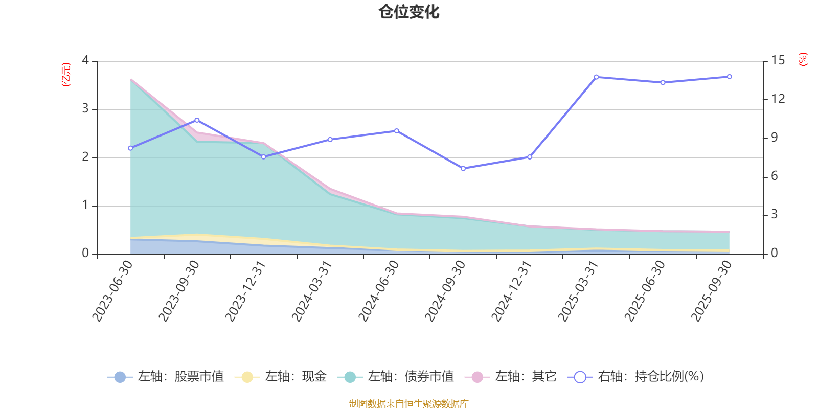 据定期报告数据统计,成立以来平均股票仓位为9.99%,同类平均为19.03%。2025年三季度末基金达到13.81%的最高仓位,2024年三季度末最低,为6.65%。