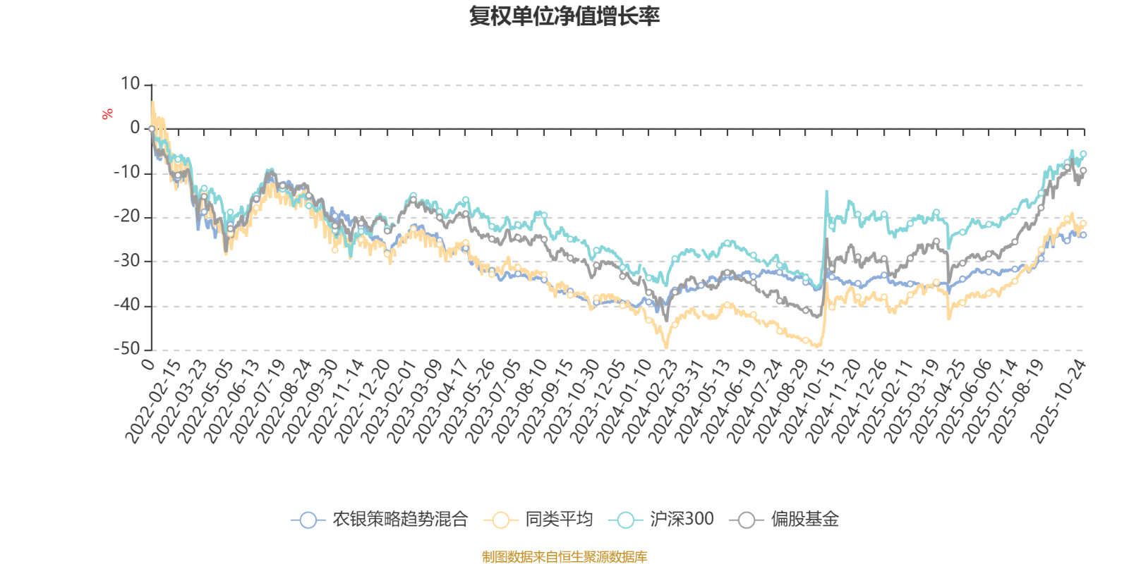 截至10月24日,农银策略趋势混合近三个月复权单位净值增长率为9.81%,位于同类可比基金422/621;近半年复权单位净值增长率为15.30%,位于同类可比基金510/618;近一年复权单位净值增长率为14.96%,位于同类可比基金485/611;近三年复权单位净值增长率为-4.33%,位于同类可比基金431/518。
