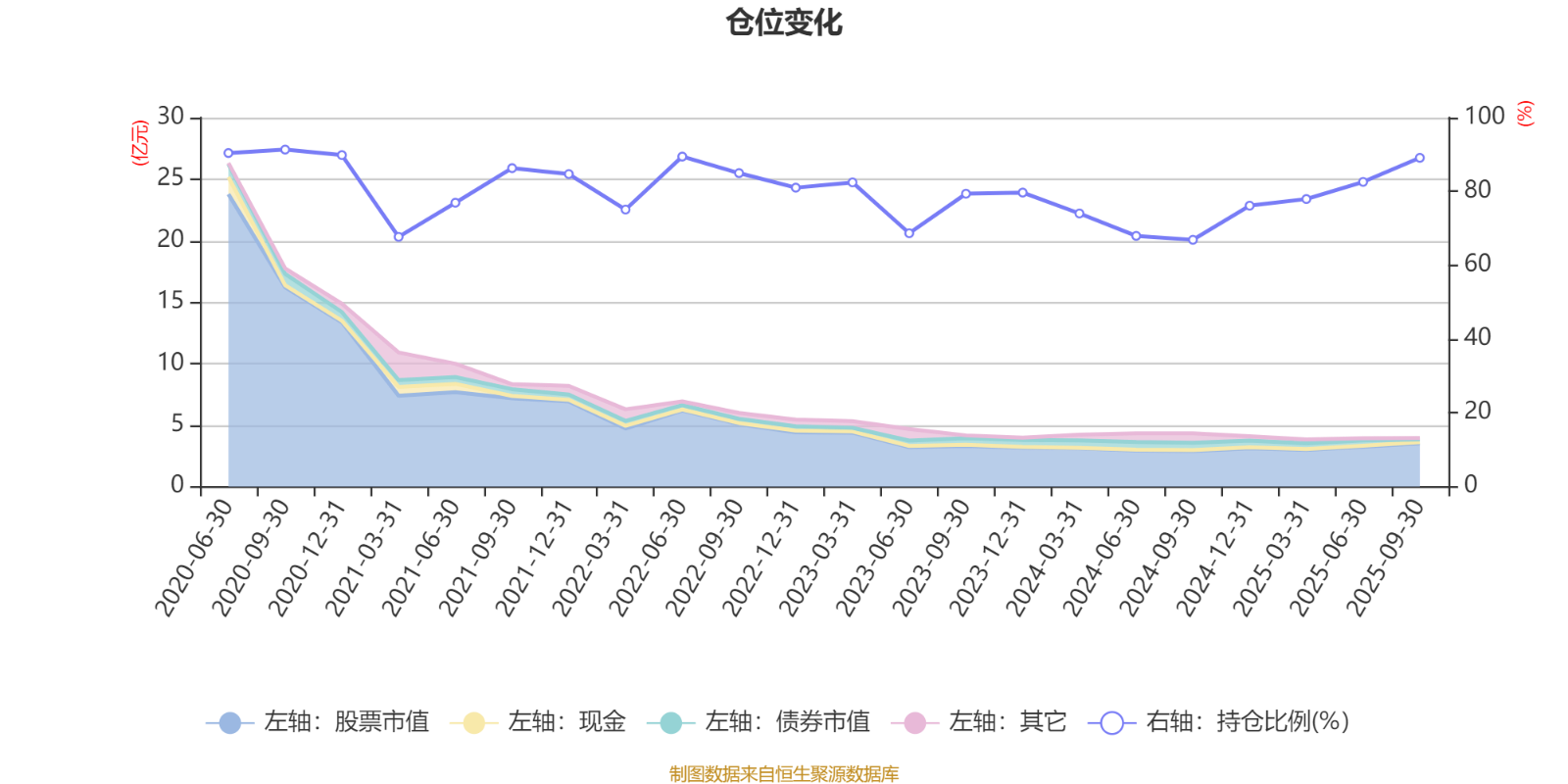 据定期报告数据统计,近三年平均股票仓位为77.14%,同类平均为85.51%。2020年三季度末基金达到91.33%的最高仓位,2024年三季度末最低,为66.88%。