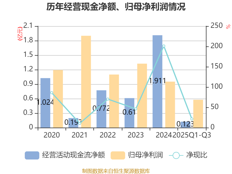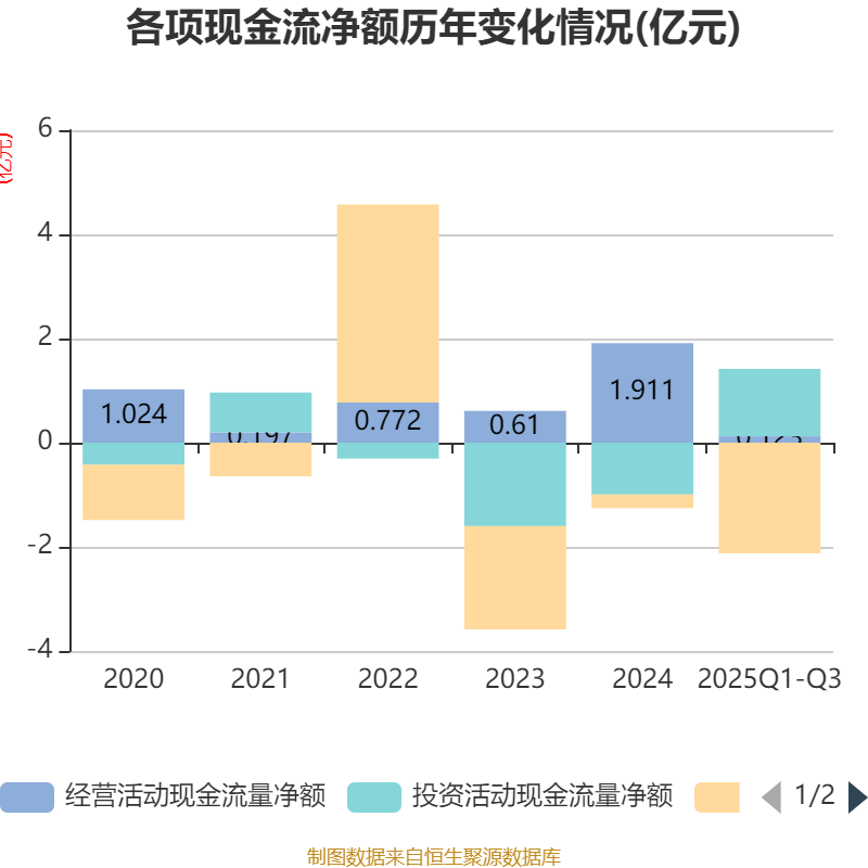 2025年前三季度,公司经营活动现金流净额为1232.86万元,同比下降92.28%;筹资活动现金流净额-2.12亿元,同比减少1.8亿元;投资活动现金流净额1.29亿元,上年同期为-1258.36万元。