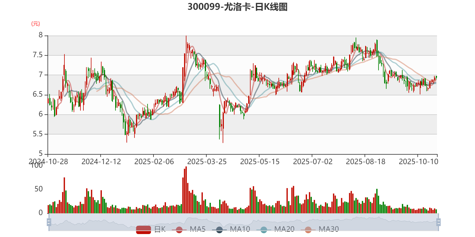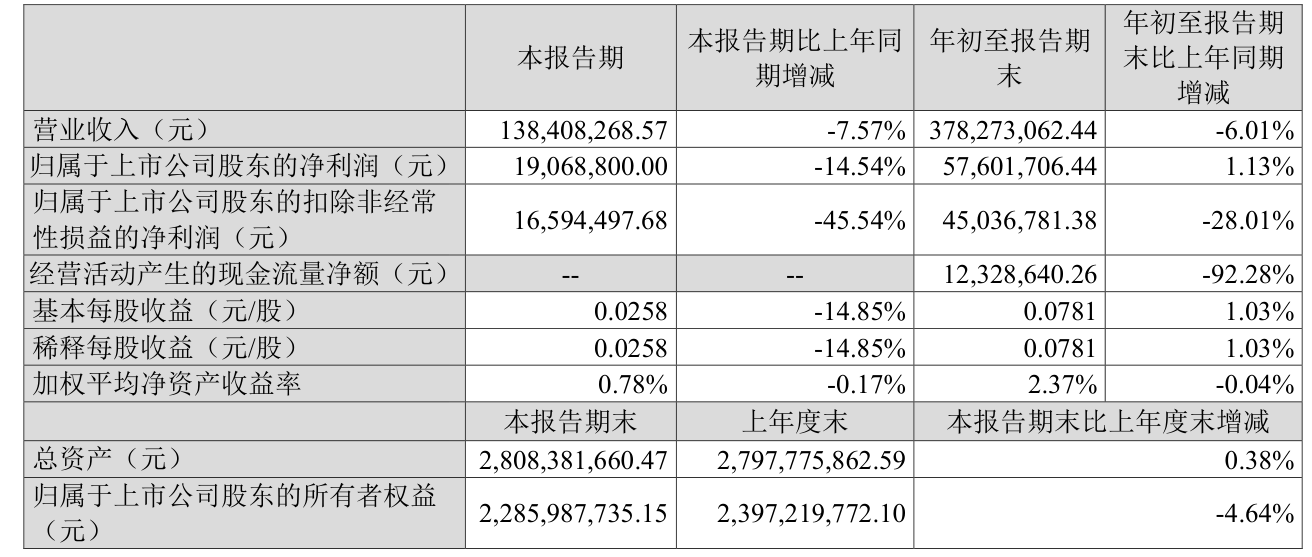 中证智能财讯尤洛卡(300099)10月28日披露2025年第三季度报告。前三季度公司实现营业总收入3.78亿元,同比下降6.01%;归母净利润5760.17万元,同比增长1.13%;扣非净利润4503.68万元,同比下降28.01%;经营活动产生的现金流量净额为1232.86万元,同比下降92.28%;报告期内,尤洛卡基本每股收益为0.0781元,加权平均净资产收益率为2.37%。