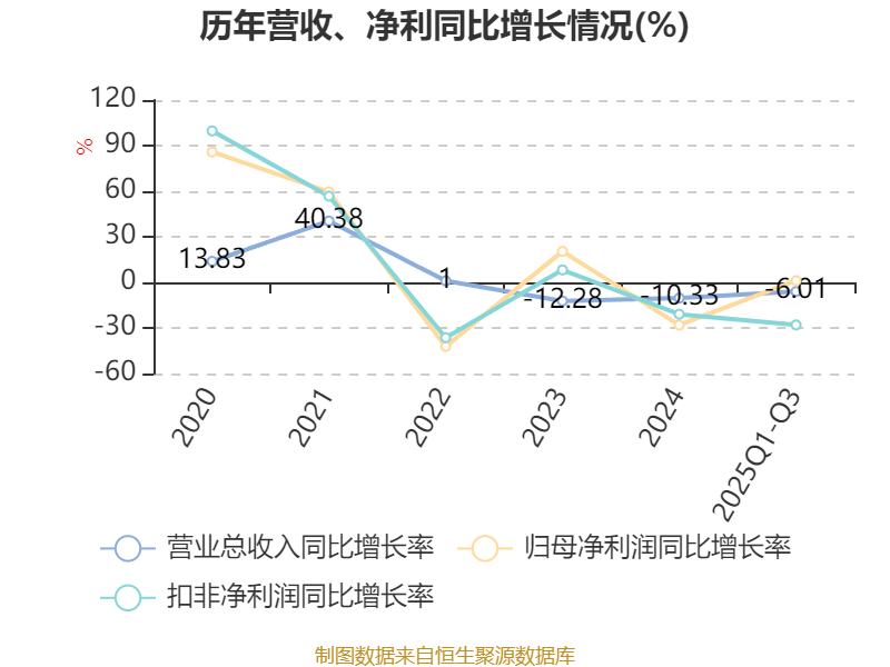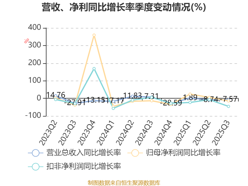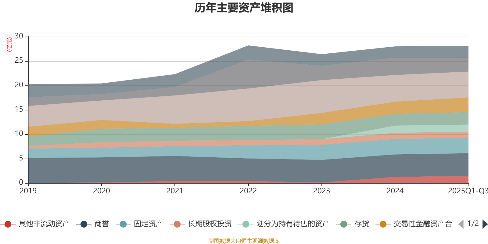 资产重大变化方面,截至2025年三季度末,公司货币资金较上年末减少19.31%,占公司总资产比重下降2.49个百分点;交易性金融资产合计较上年末增加20.13%,占公司总资产比重上升1.75个百分点;在建工程合计较上年末增加60.58%,占公司总资产比重上升0.93个百分点;其他非流动资产较上年末增加19.63%,占公司总资产比重上升0.85个百分点。