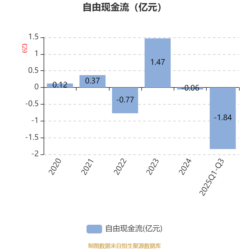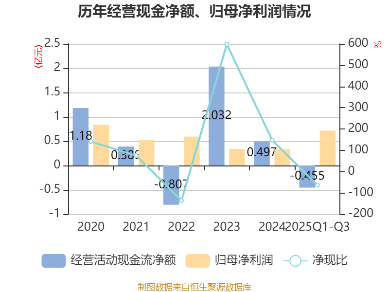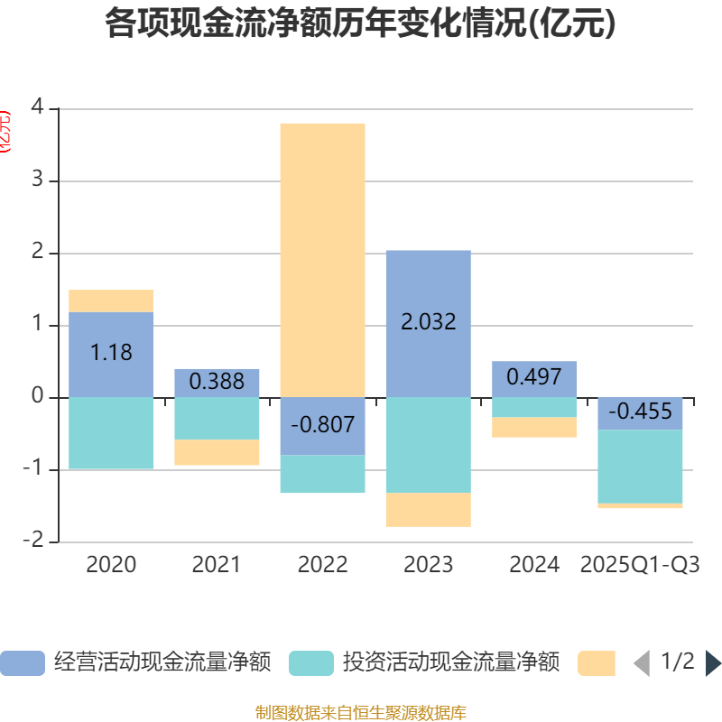 2025年前三季度,公司经营活动现金流净额为-4552.84万元,同比减少2251.81万元;筹资活动现金流净额-658.96万元,同比增加594.31万元;投资活动现金流净额-1.02亿元,上年同期为-2.68亿元。