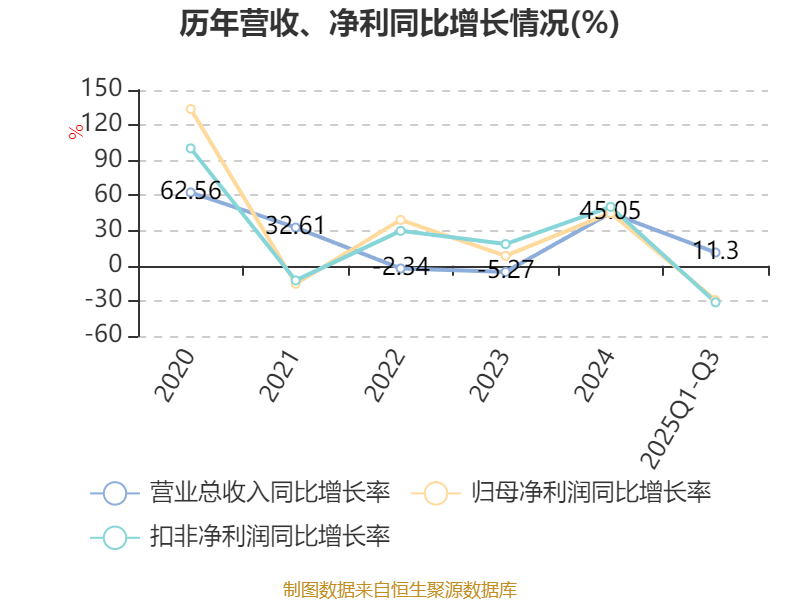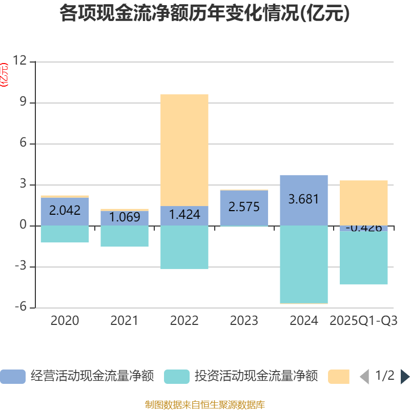 2025年前三季度,公司经营活动现金流净额为-4262.12万元,同比减少3.29亿元;筹资活动现金流净额3.3亿元,同比增加1.62亿元;投资活动现金流净额-3.88亿元,上年同期为-3.37亿元。
