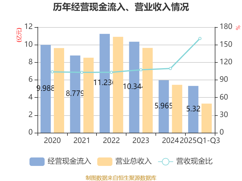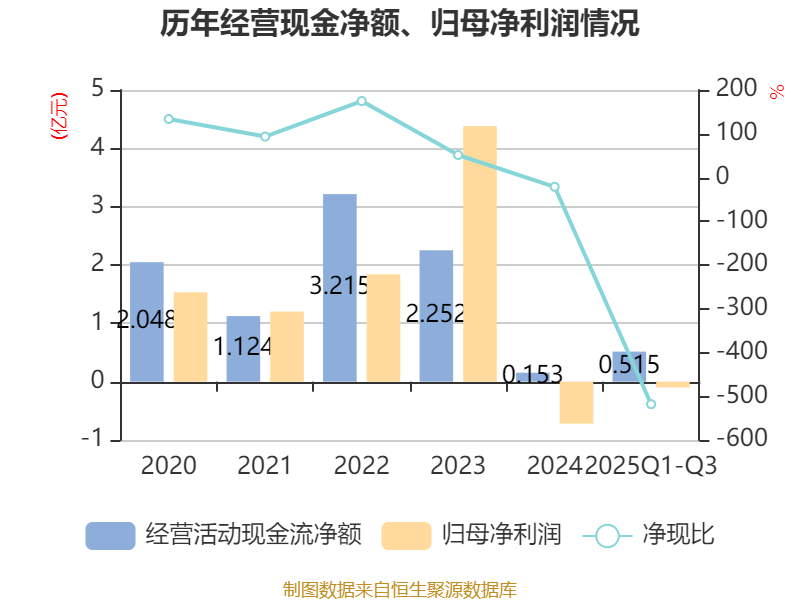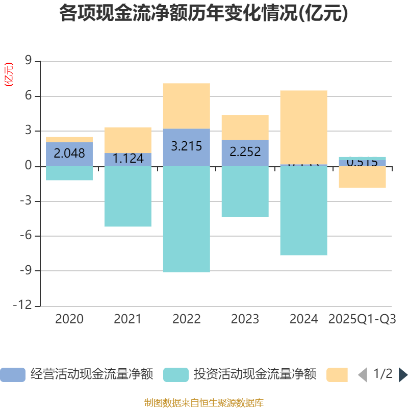 2025年前三季度,公司经营活动现金流净额为5149.22万元,同比增加7359.19万元;筹资活动现金流净额-1.85亿元,同比减少10.82亿元;投资活动现金流净额2645.76万元,上年同期为-9.42亿元。