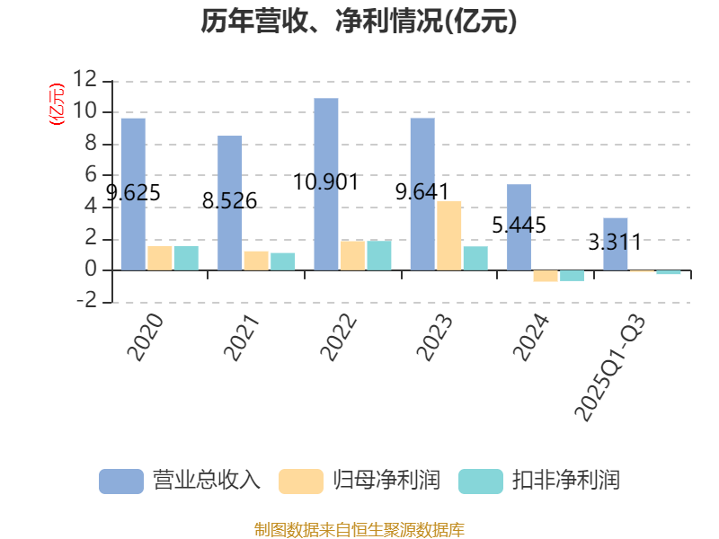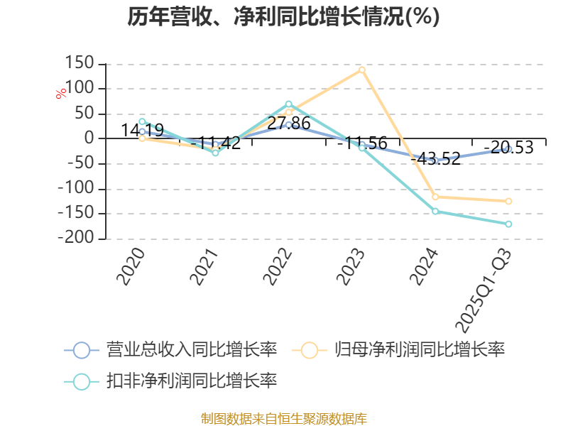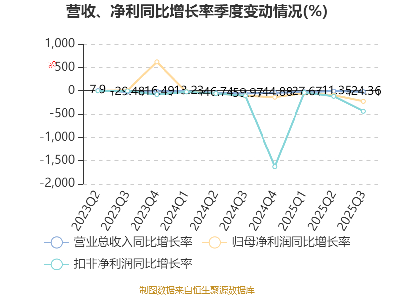 中证智能财讯同德化工(002360)10月28日披露2025年第三季度报告。前三季度公司实现营业总收入3.31亿元,同比下降20.53%;归母净利润亏损993.70万元,上年同期盈利3930.66万元;扣非净利润亏损2446.73万元,上年同期盈利3443.51万元;经营活动产生的现金流量净额为5149.22万元,上年同期为-2209.98万元;报告期内,同德化工基本每股收益为-0.02元,加权平均净资产收益率为-0.05%。