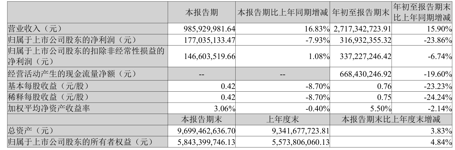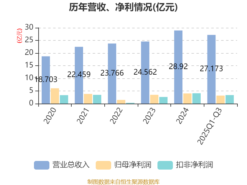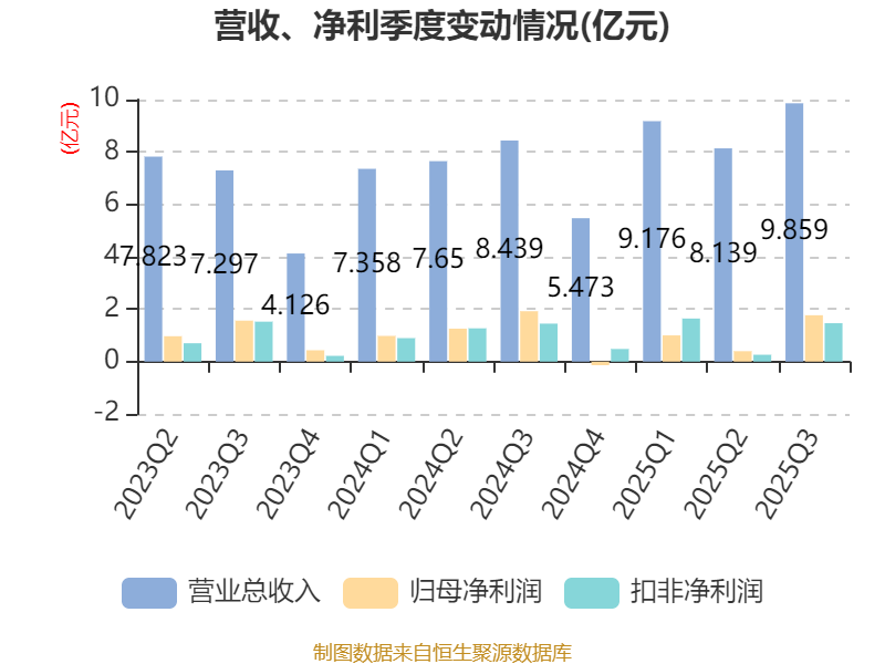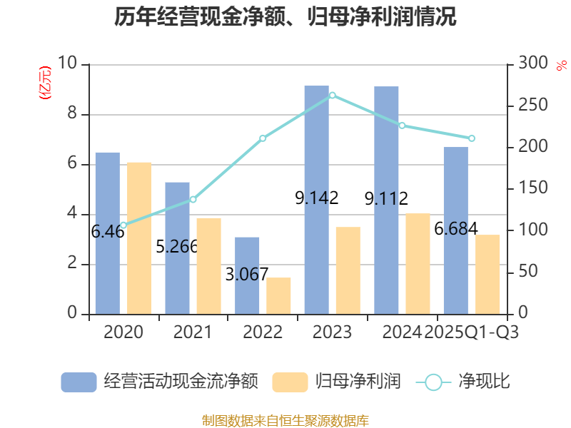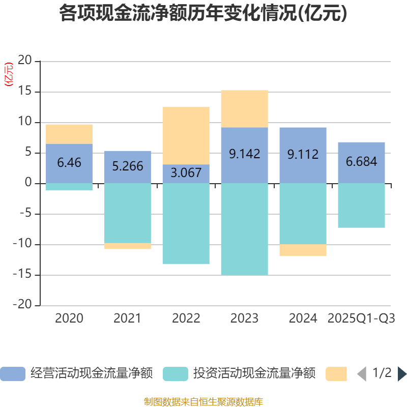 2025年前三季度,公司经营活动现金流净额为6.68亿元,同比下降19.6%;筹资活动现金流净额278.66万元,同比增加2.03亿元;投资活动现金流净额-7.3亿元,上年同期为-7.82亿元。