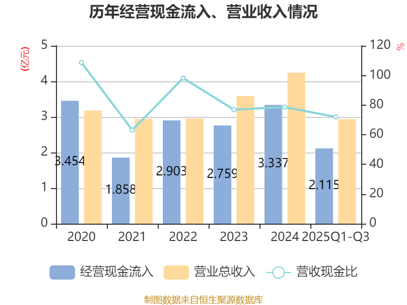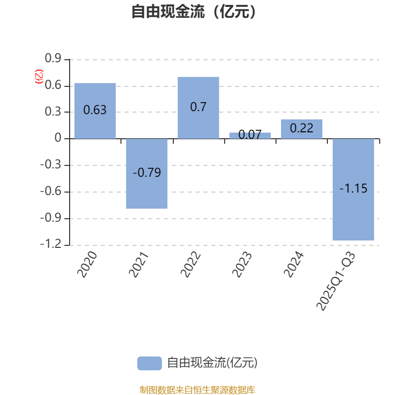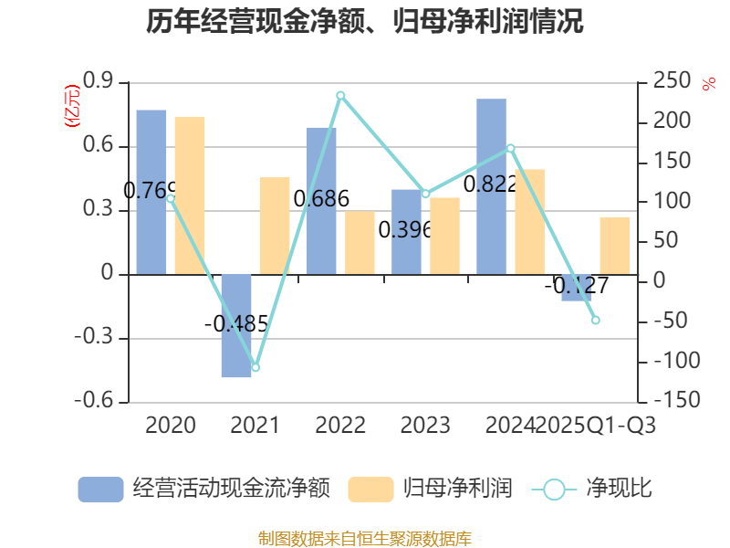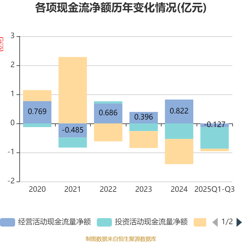 2025年前三季度,公司经营活动现金流净额为-1271.38万元,同比减少8357.75万元;筹资活动现金流净额-866.58万元,同比增加9334.53万元;投资活动现金流净额-7438.82万元,上年同期为-2855.39万元。