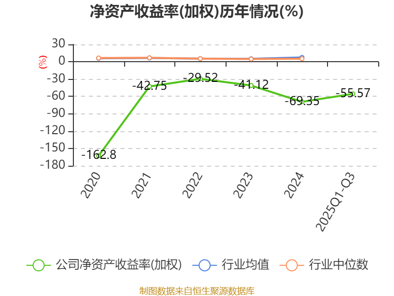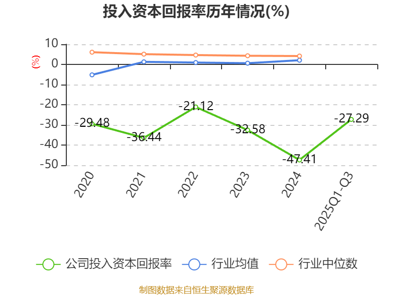 盈利能力方面, 2025年前三季度公司加权平均净资产收益率为-55.57%,同比下降23.93个百分点。公司2025年前三季度投入资本回报率为-27.29%,较上年同期上升1.56个百分点。