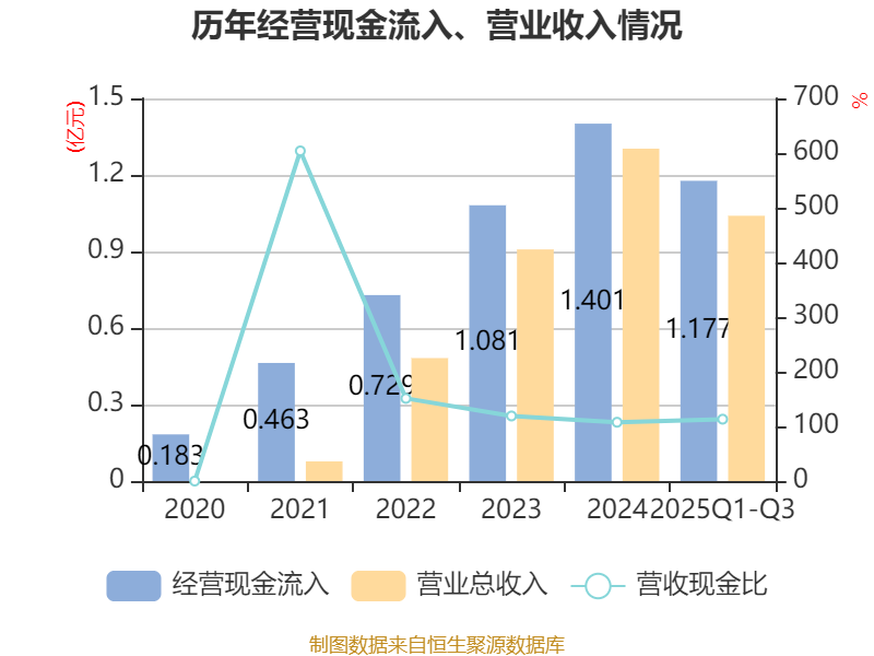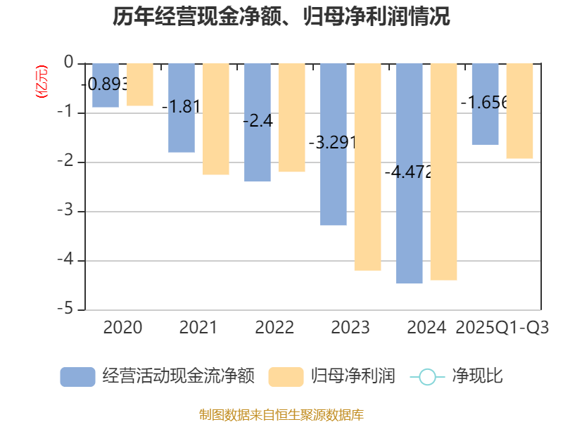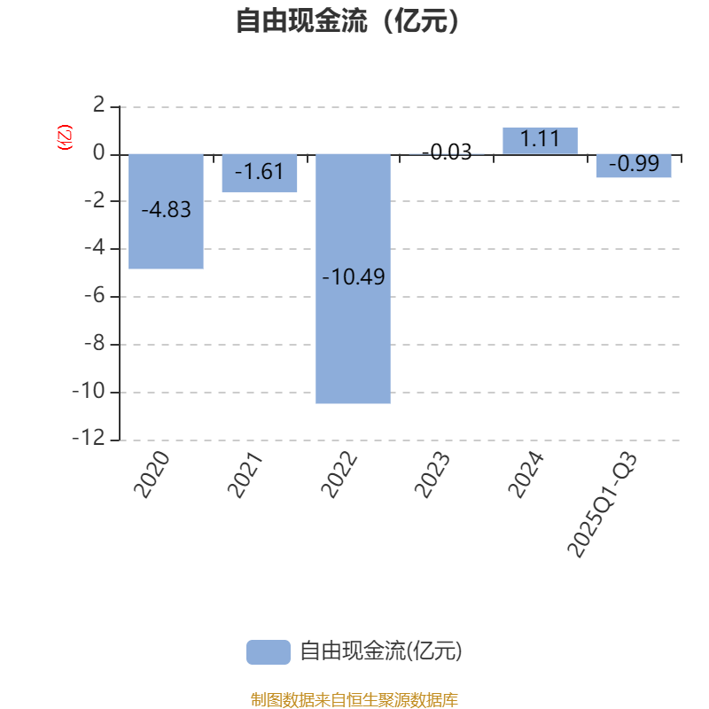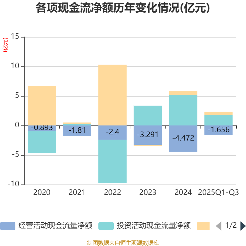 2025年前三季度,公司经营活动现金流净额为-1.66亿元,同比增加1.28亿元;筹资活动现金流净额5405.16万元,同比减少1987.82万元;投资活动现金流净额1.77亿元,上年同期为3.39亿元。