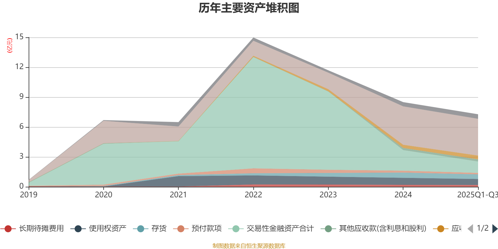 资产重大变化方面,截至2025年三季度末,公司交易性金融资产合计较上年末减少44.61%,占公司总资产比重下降8.62个百分点;货币资金较上年末减少4.51%,占公司总资产比重上升5.25个百分点;应收票据及应收账款较上年末增加21.05%,占公司总资产比重上升1.55个百分点;其他流动资产较上年末增加17.07%,占公司总资产比重上升1.32个百分点。