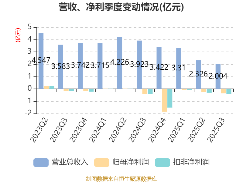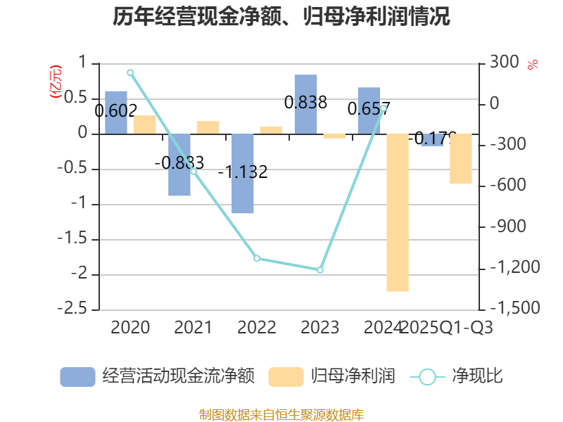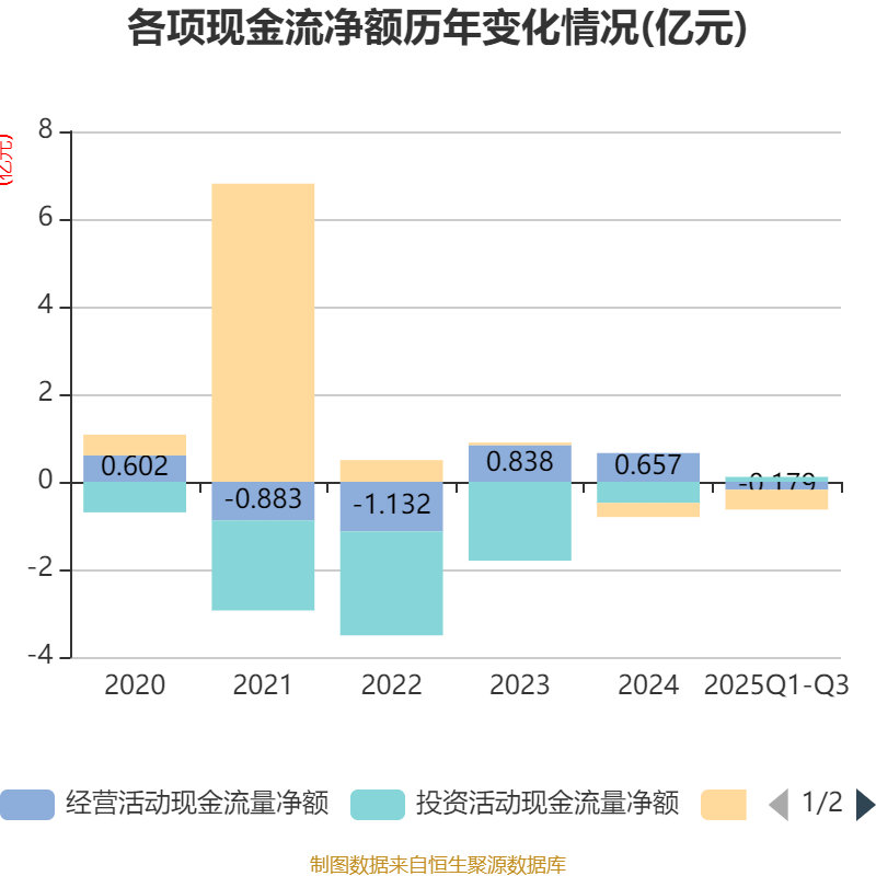 2025年前三季度,公司经营活动现金流净额为-1794.71万元,同比减少6701.56万元;筹资活动现金流净额-4543.38万元,同比减少894.42万元;投资活动现金流净额1115.46万元,上年同期为-5366.44万元。
