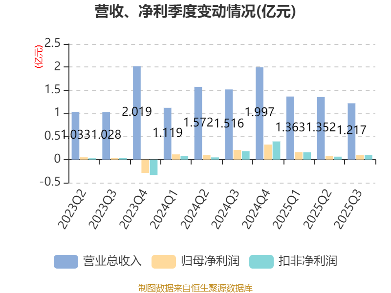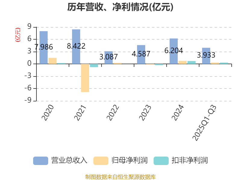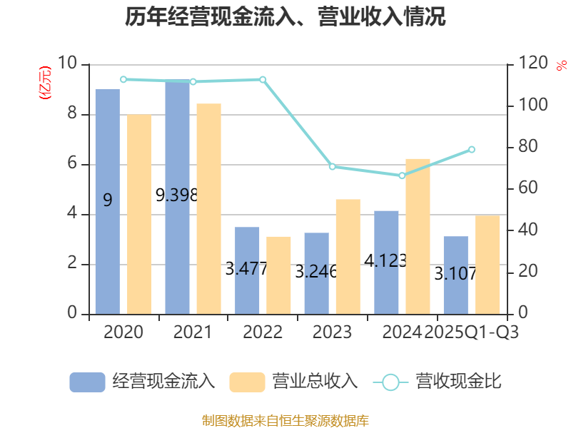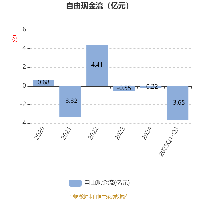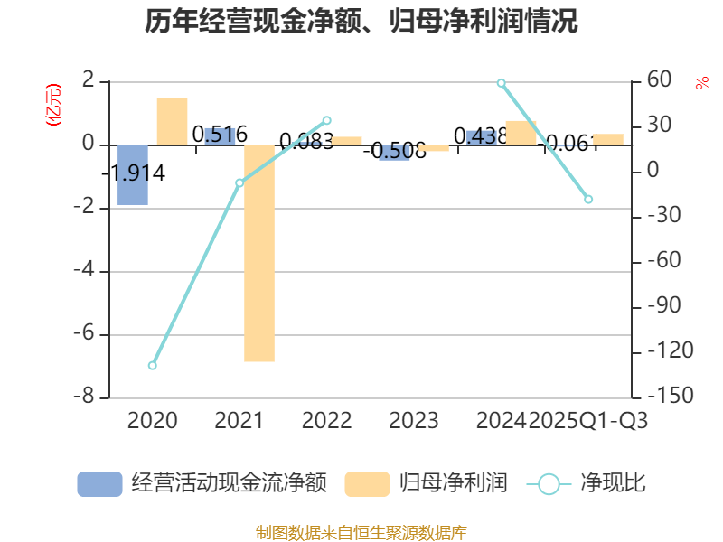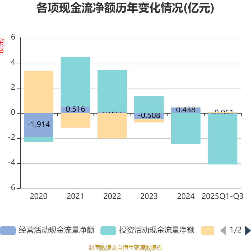 2025年前三季度,公司经营活动现金流净额为-614.63万元,同比增加3647.24万元;筹资活动现金流净额760.7万元,同比增加447.58万元;投资活动现金流净额-4.05亿元,上年同期为-4.85亿元。