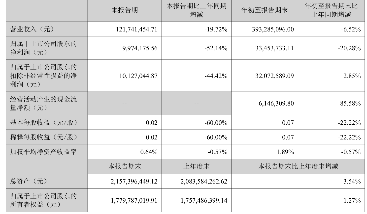 中证智能财讯南风股份(300004)10月28日披露2025年第三季度报告。前三季度公司实现营业总收入3.93亿元,同比下降6.52%;归母净利润3345.37万元,同比下降20.28%;扣非净利润3207.26万元,同比增长2.85%;经营活动产生的现金流量净额为-614.63万元,上年同期为-4261.87万元;报告期内,南风股份基本每股收益为0.07元,加权平均净资产收益率为1.89%。